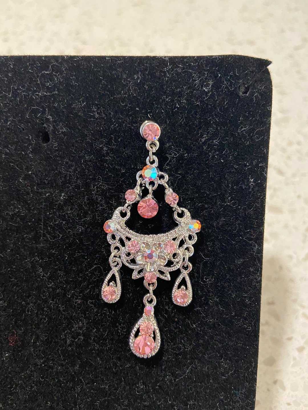 Selling a cute jewellery set! Includes a necklace and a pair of earrings. The set is decorated with pink rhinestones and comes in a box. Never used.