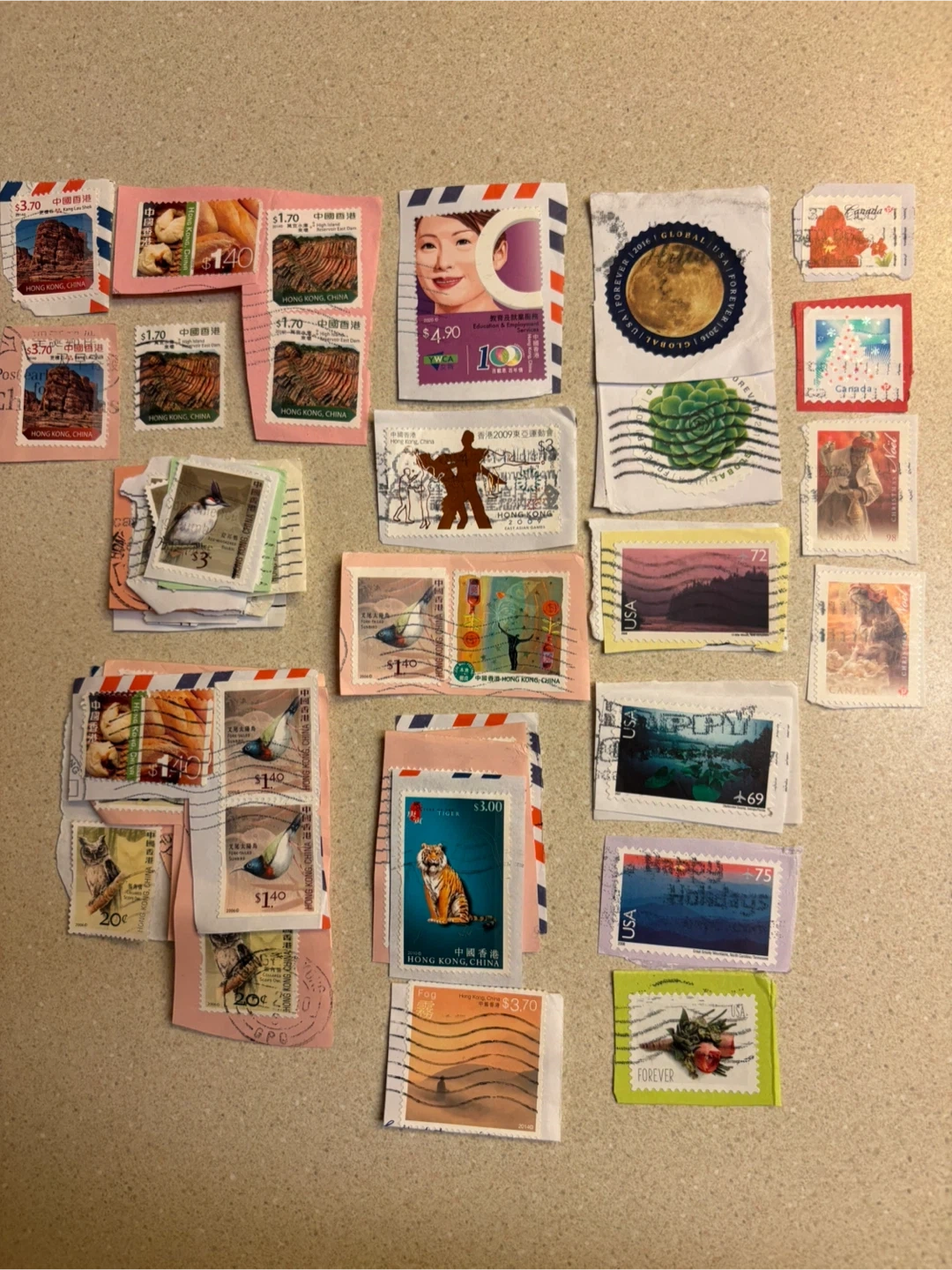Selling a collection of over 25 used stamps from Hong Kong, USA and Canada. Great for collectors or crafting projects! Some stamps feature unique design and scenery.