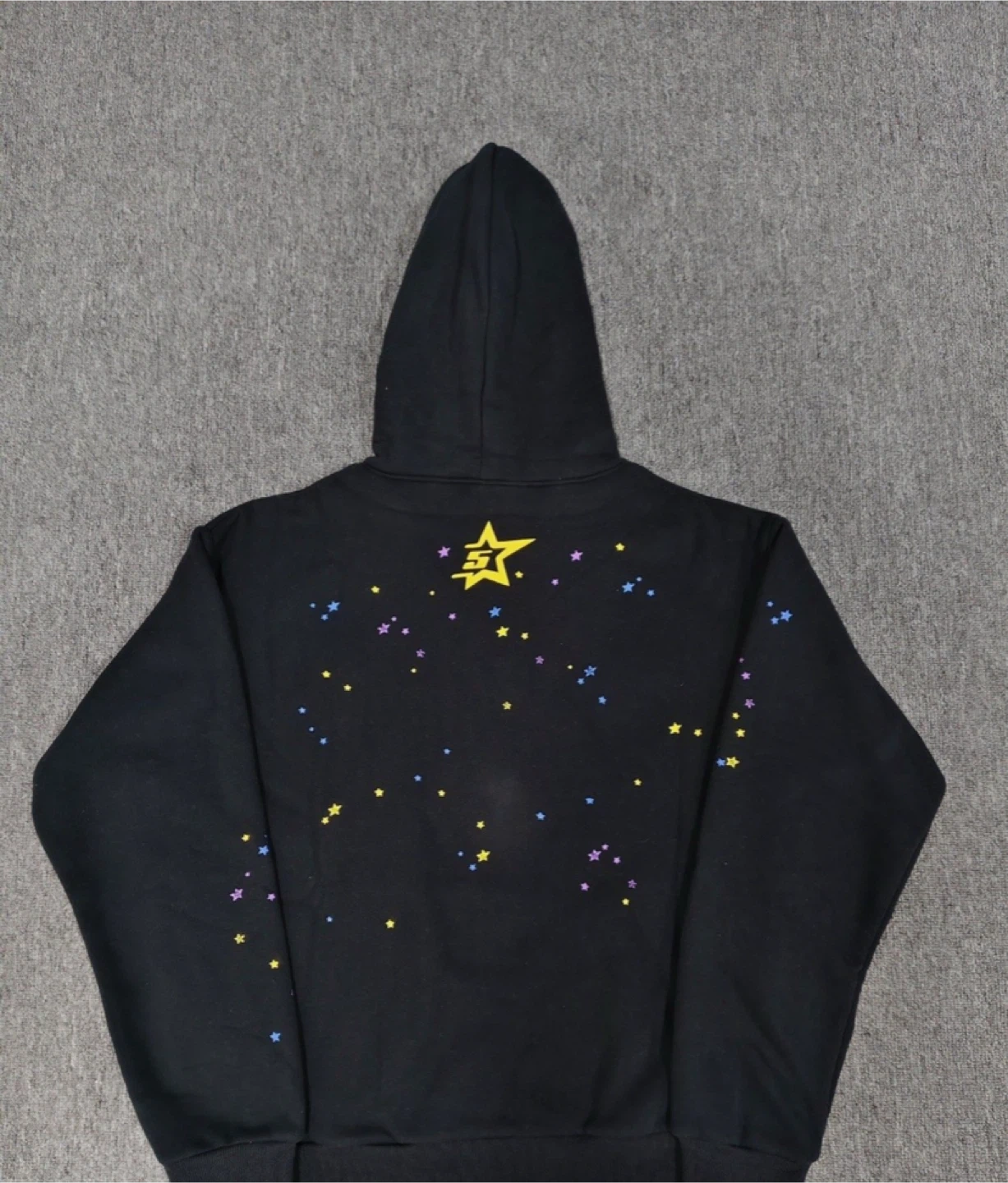 Selling a black Sp5der hoodie with a unique design. It features the word "Sp5der!" in pink with a spiderweb design. There are also colourful stars scattered on the sleeves and back. It's in great condition and ready for a new owner!