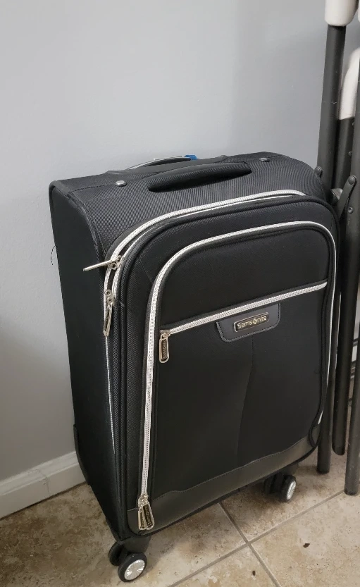 Selling a Samsonite carry-on suitcase in black. It's in great shape and ready for your next trip! It has a convenient front pocket and a spacious interior with straps to keep your belongings secure.