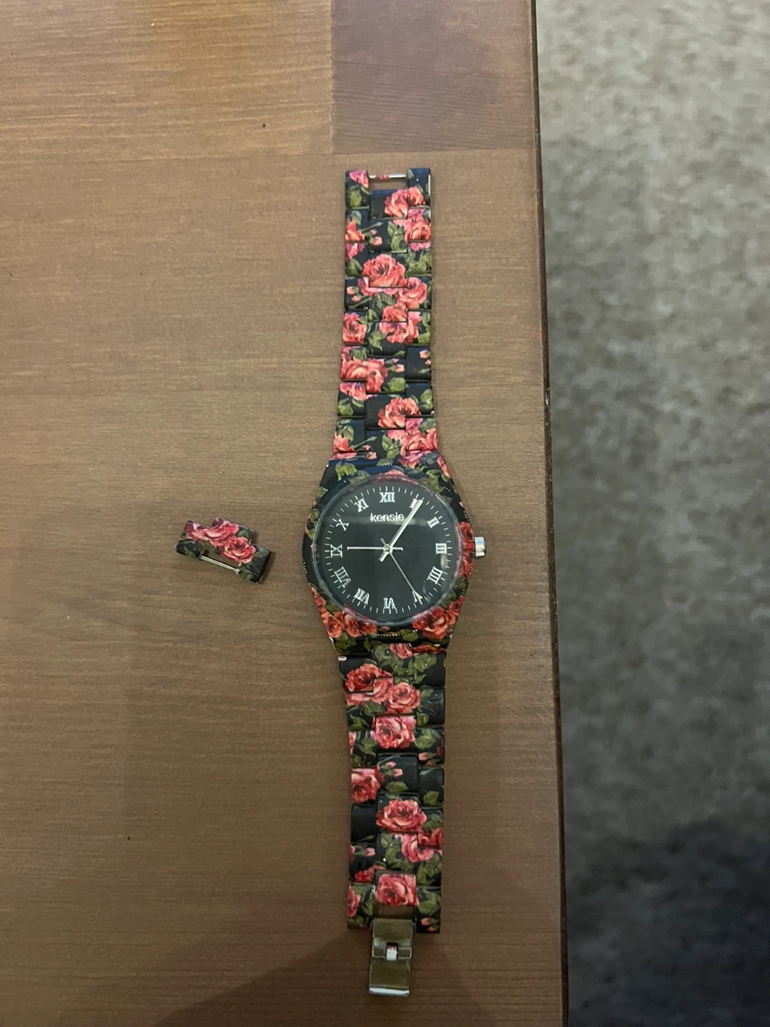 Selling a Kensie floral watch, model KEN5181. It features a stainless steel caseback and a Japanese movement. The watch has a unique floral design on the band and face. Perfect for adding a touch of style to any outfit! Needs a new battery. Comes with extra link for sizing up.