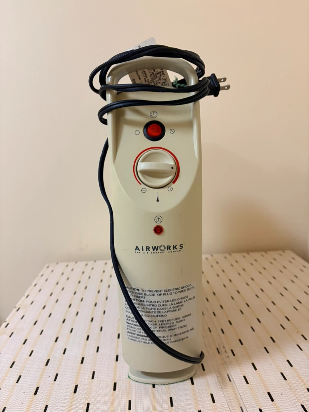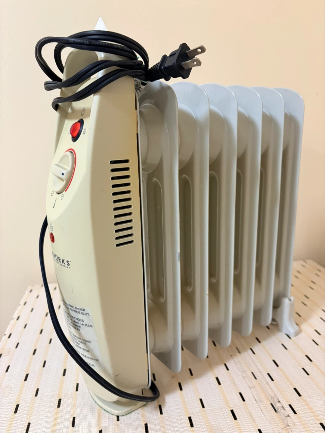 Oil-filled radiator heater. It's perfect for adding some extra warmth to a room during winter. It has a simple control knob to adjust the heat settings. 33cmx12cm. Height is 40cm.