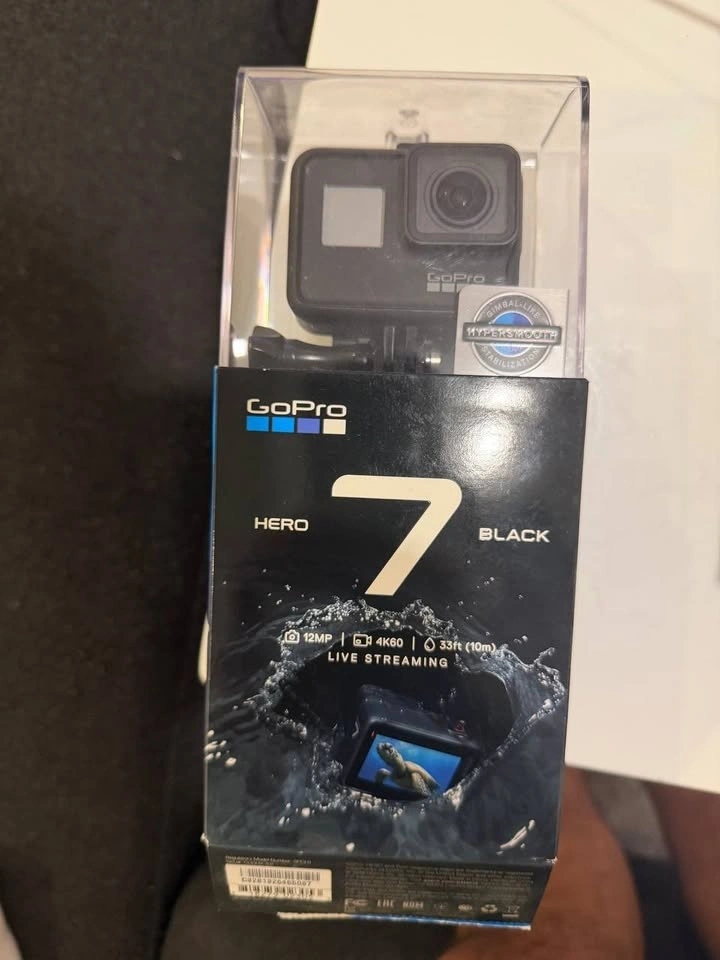 Selling a used in good condition Gopro Hero 7 Black camera with 1 battery, box, usb cable, 3m sticky mounts, and a 256GB micro SD memory card.