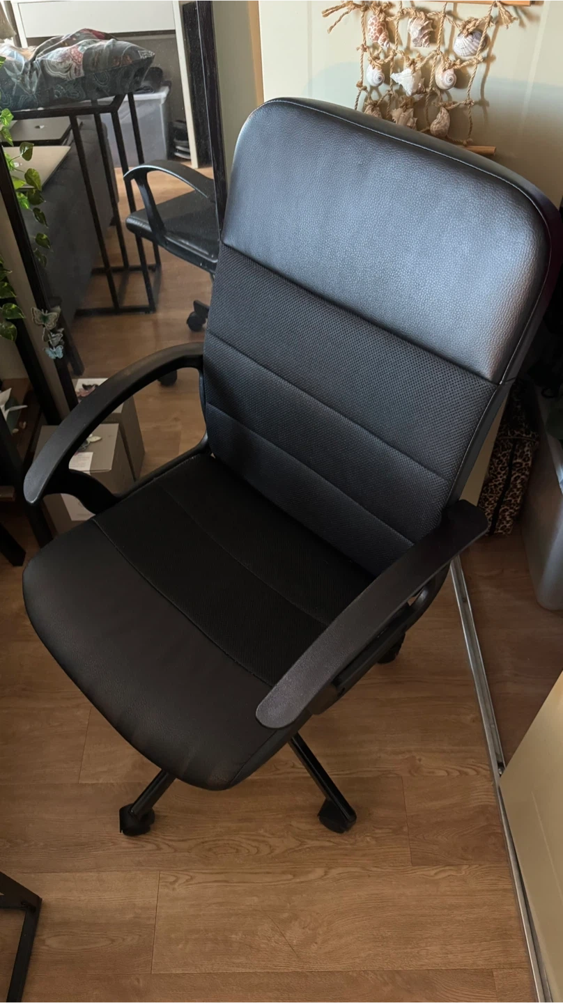 Comfortable IKEA office chair in black faux-leather with breathable fabric panels. Swivel base with wheels rolls smoothly and the seat is still very comfy for long study or work sessions. Some minor signs of normal use but no rips or major damage. Clean and from a smoke-free home.