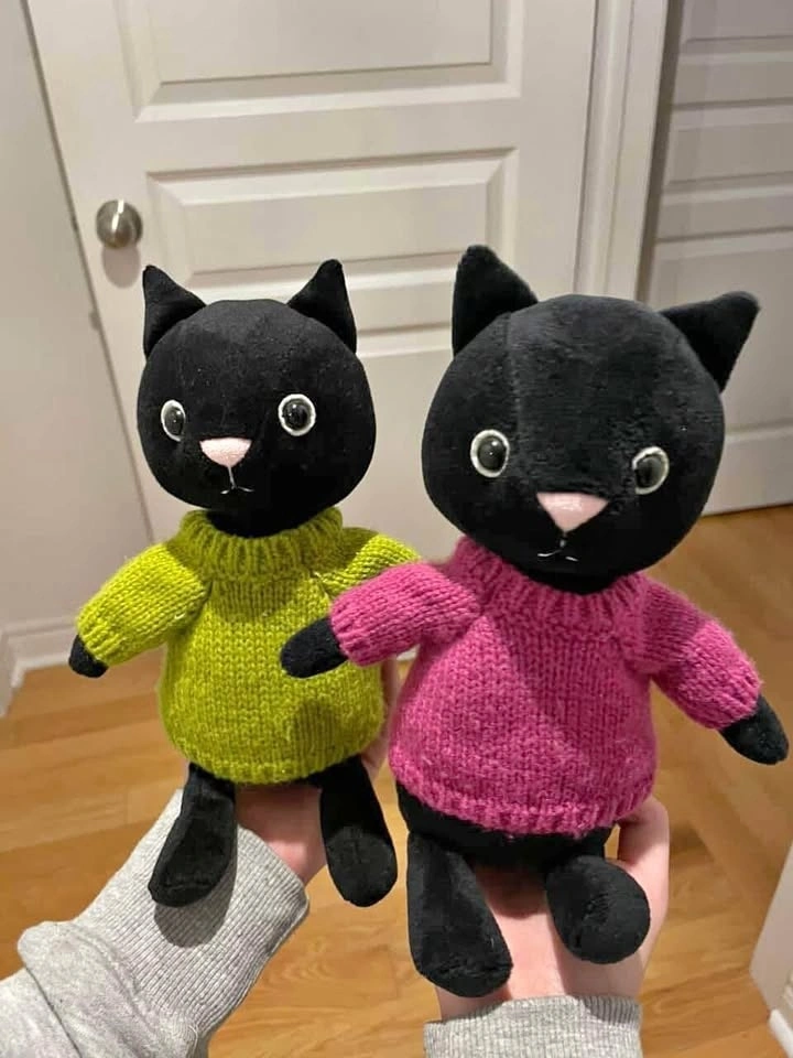 Fuschia knit sweater kitten and lime knit sweater kitten Jellycat.
