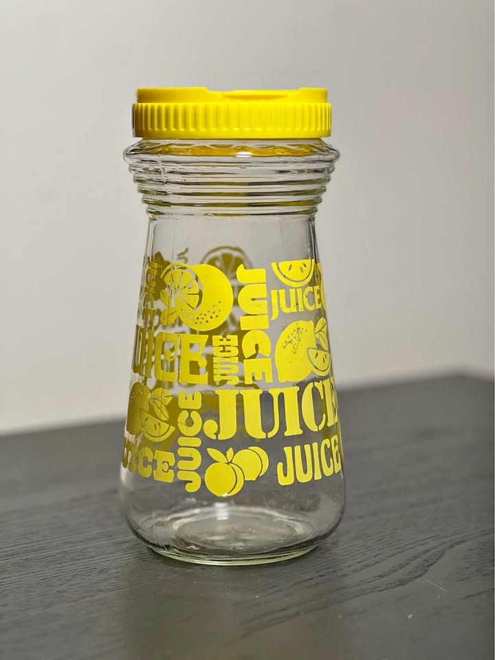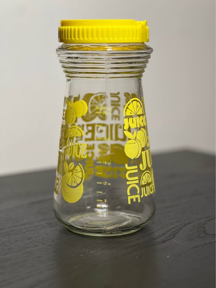 Vintage Anchor Hocking Glass Juice Carafe. Graphic print of lemons & "juice". Plastic yellow lid that screws on and has a snap spout cover. There's measurements on the side of the carafe that go up to 24 ounces.