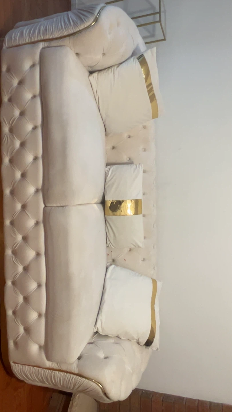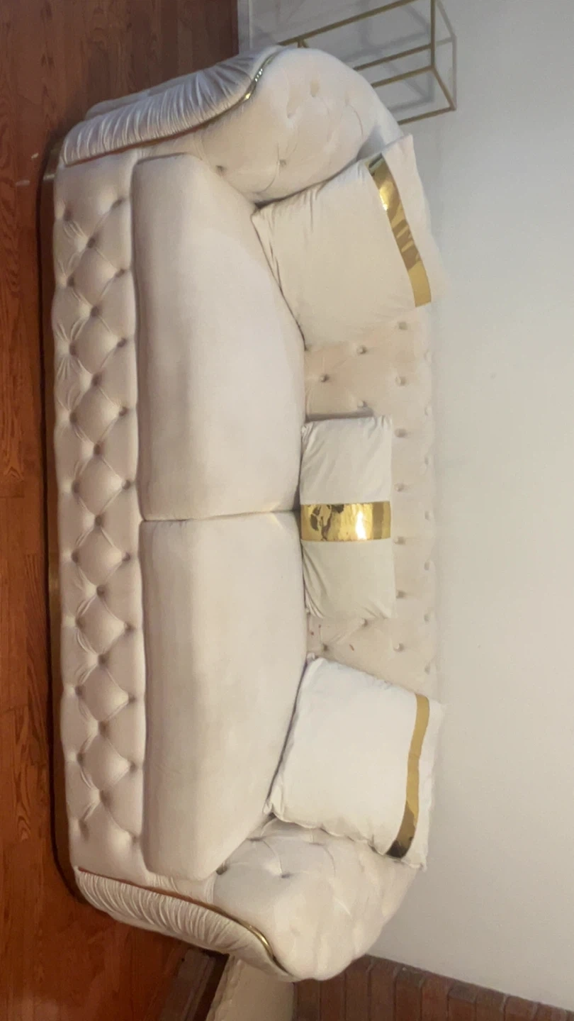 Selling a beige sofa and love seat that would look great in any living room! It comes with throw pillows as well. There are some stains on the sofa.