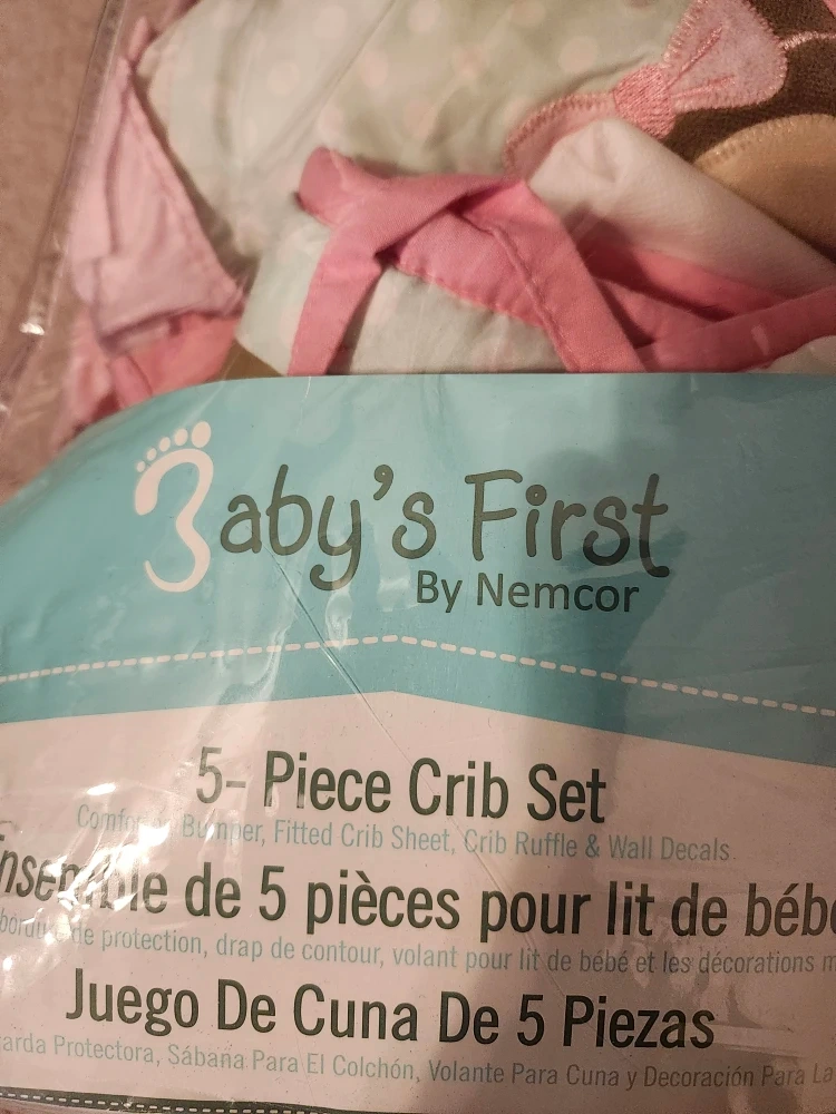 Selling a Baby's First 5-piece crib set! It includes a comforter, bumper, fitted crib sheet, crib ruffle, and wall decals. Perfect for setting up a cute nursery!