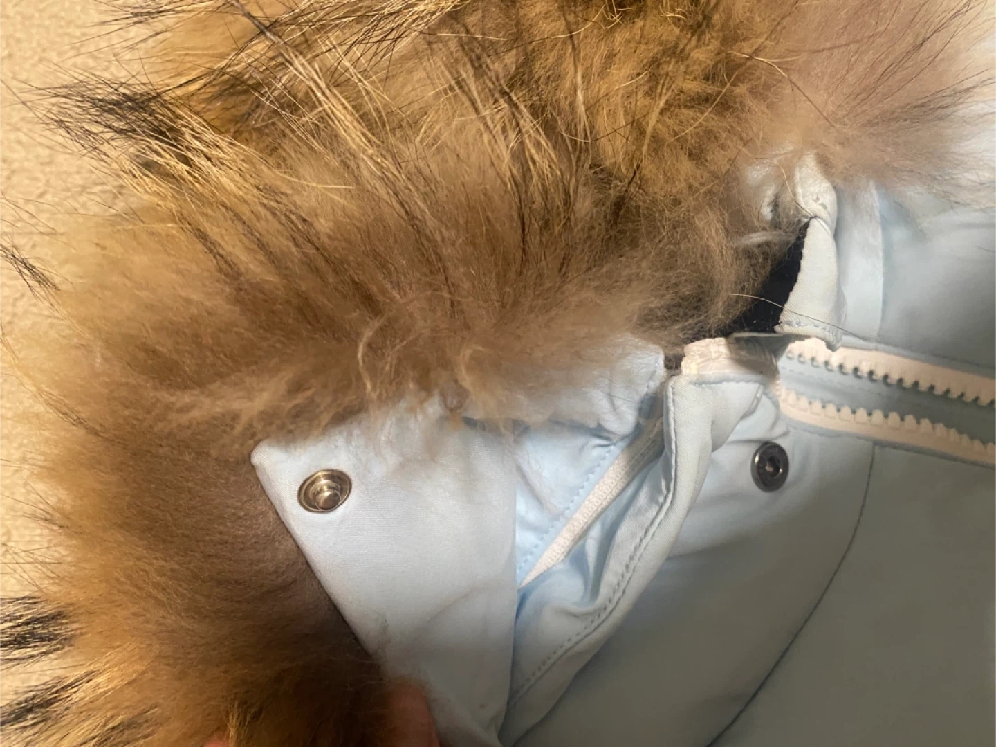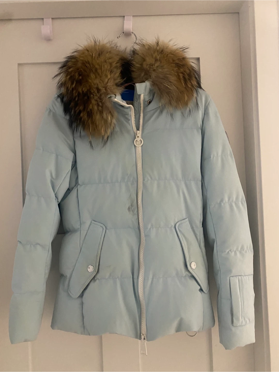 Selling a Rossignol women's ski jacket in a lovely light blue colour! It has a stylish fur-trimmed hood and plenty of pockets. Perfect for hitting the slopes this winter! Some staining on the front might be able to remove with washing/ cleaning. Not noticeable when wearing. Detachable liningon the neck
