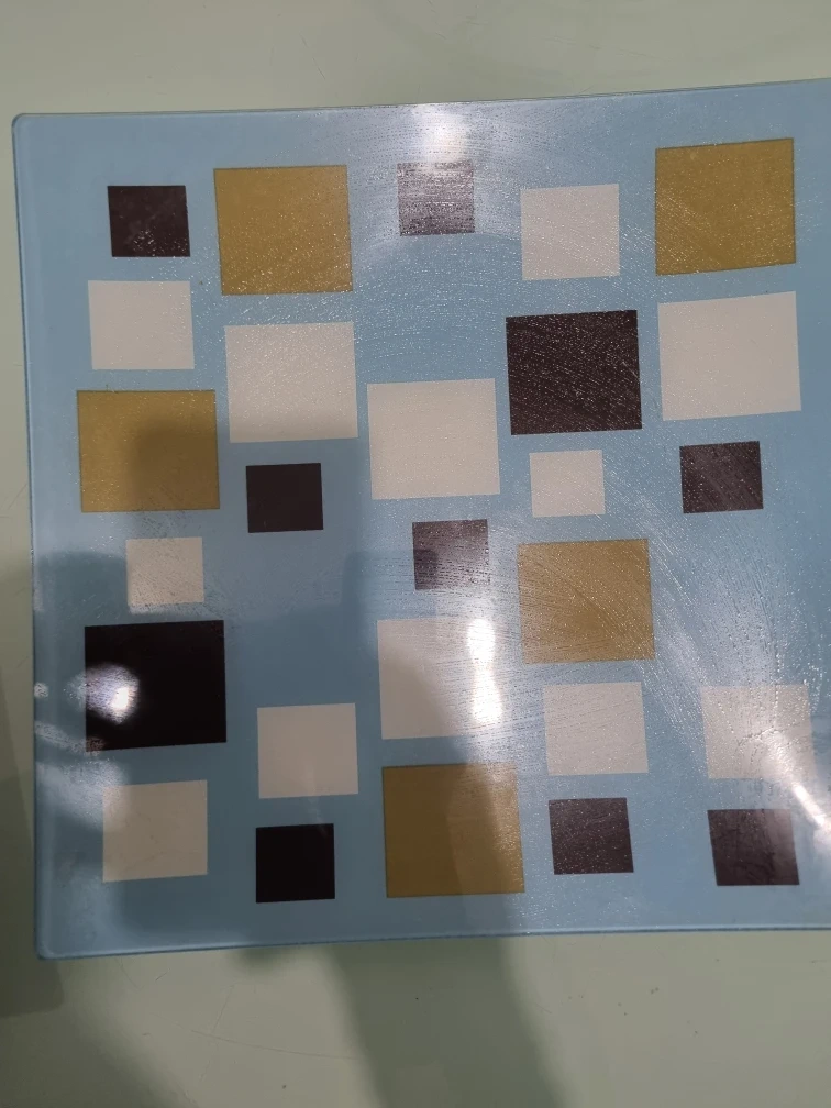Here's a cute decorative square glass plate! It has a light blue background with brown, white, and gold squares. It's perfect for adding a pop of colour to your space