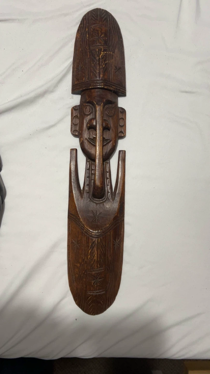 Selling a vintage carved wooden mask. It has a unique design and would make a great addition to any collection or as a decorative piece for your home. It's in good condition and ready for a new home!