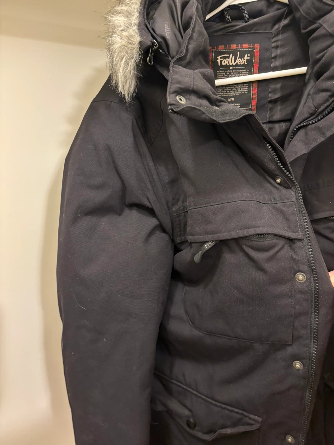 Selling a Far West winter parka in size M! It's a stylish and warm jacket, perfect for the Canadian winter. It comes in black and has a faux fur trim on the hood. It's in great condition and ready to keep you cozy this season!