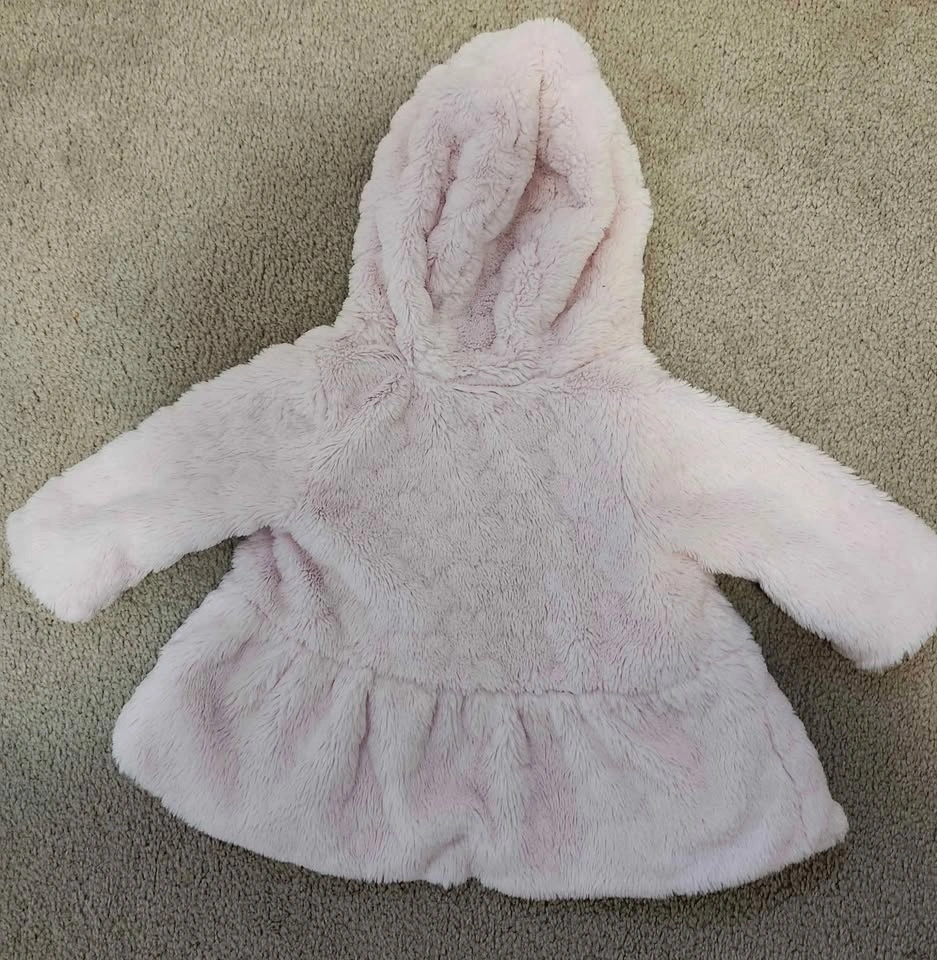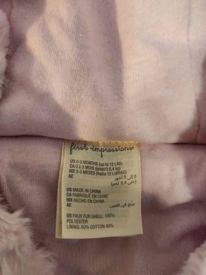 A super cute and cozy faux fur coat from First Impressions for your little one! It's a light pink colour and perfect for ages 0-3 months (up to 12 lbs). The outer shell is 100% polyester, and the lining is 60% cotton and 40% polyester, so it's soft and comfy against baby's skin. Pick up in Riverbend North Main Street
