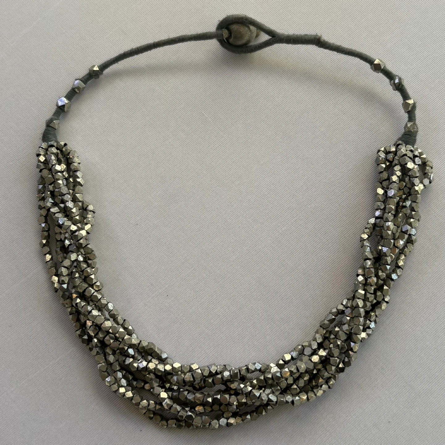 Stunning chunky necklace featuring multiple braided strands of faceted pewter-toned beads, likely Pyrite or Hematite. Finished with a thread-wrapped bead and loop closure. Measures approximately 18 inches at its full length. Perfect statement piece.