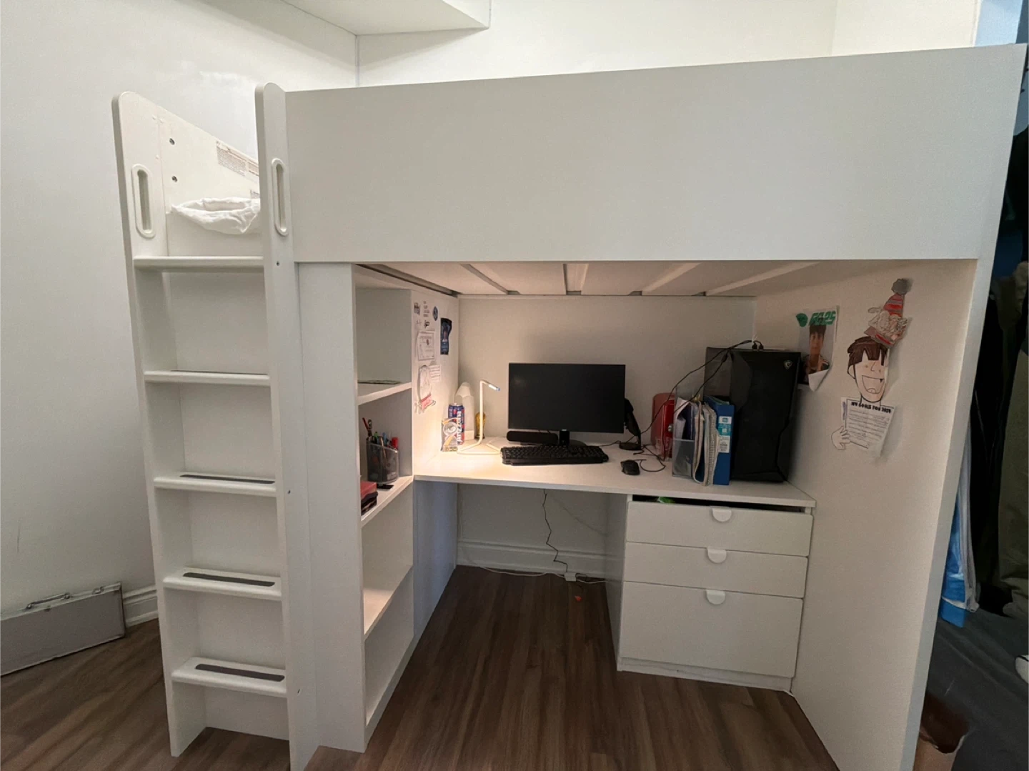 Selling an IKEA Småstad loft bed combo in white! This setup includes a desk, wardrobe, and shelving, making it a great space-saving solution for a kid's room. Dimensions are roughly 77 1/2" long, 44 7/8" wide, and 71 5/8" high. Perfect for maximizing space!