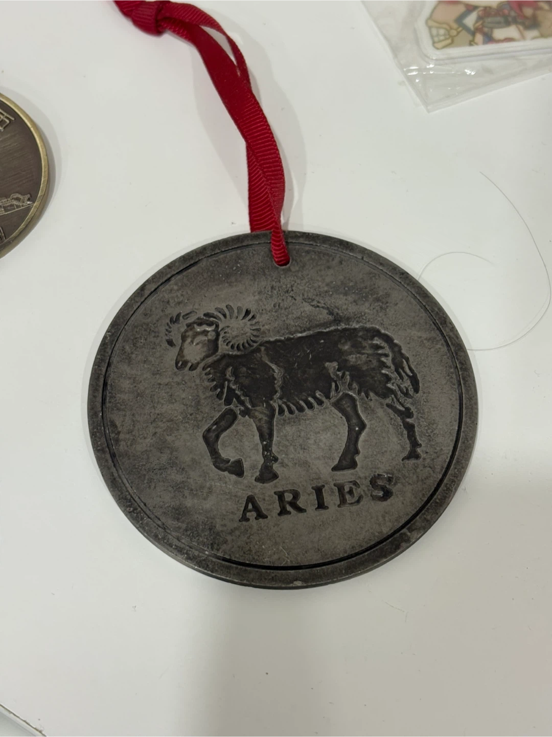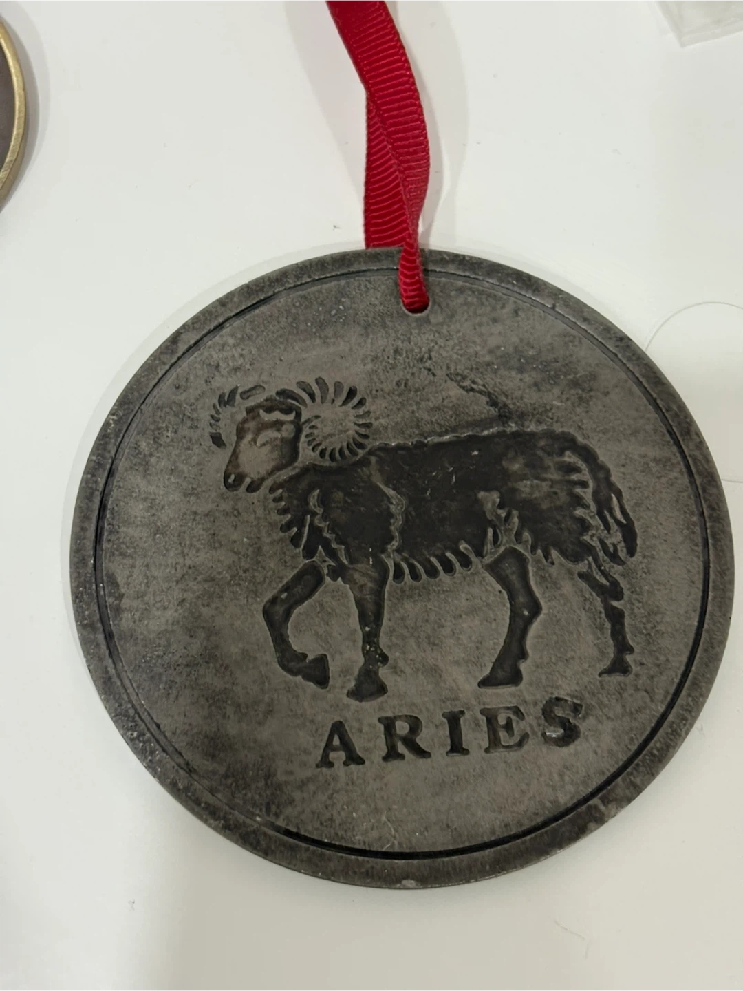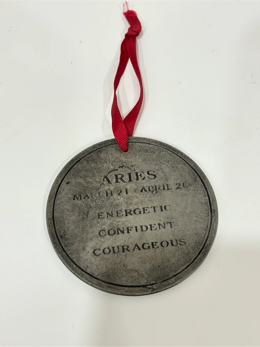 Aries zodiac ornament with a red ribbon. It features the Aries zodiac sign and the dates March 21 - April 20. The ornament also lists the traits energetic, confident, and courageous