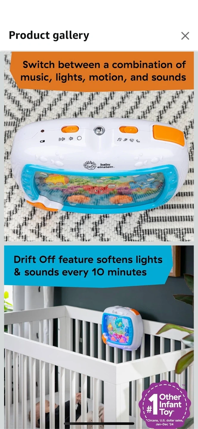 This Baby Einstein Sea Dreams Soother is a musical crib toy and sound machine, perfect for newborns and up! It features 25+ minutes of melodies, lights, and sounds. You can also switch between a combination of music, lights, motion, and sounds. The 'Drift Off' feature softens lights and sounds every 10 minutes, and it even comes with a remote to play and stop the music!