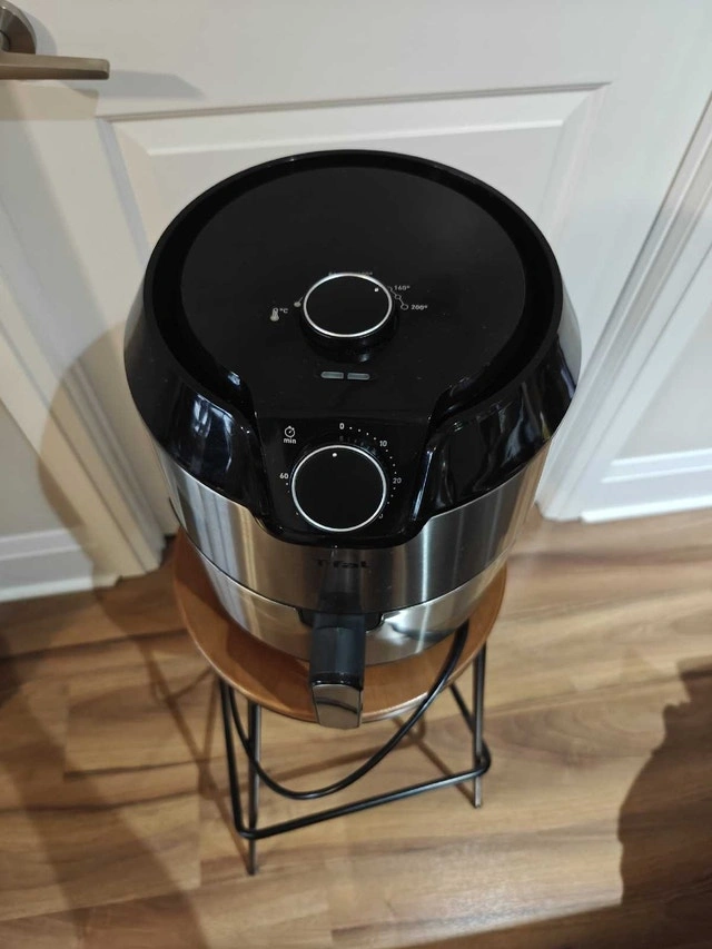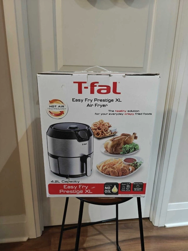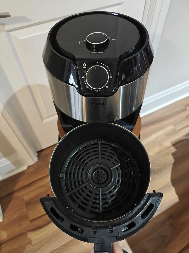 T-fal air fryer with a 4.2L capacity including accessories (tongs, tray grabber tool, trays, silicone brush, silicone muffin tray, paper basket liner). Used with some wear but in working condition.