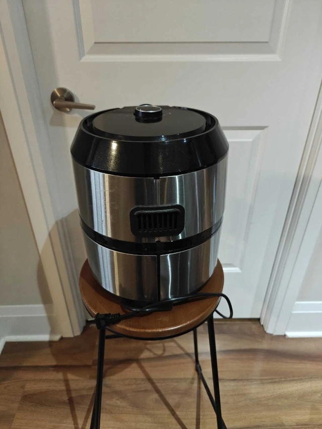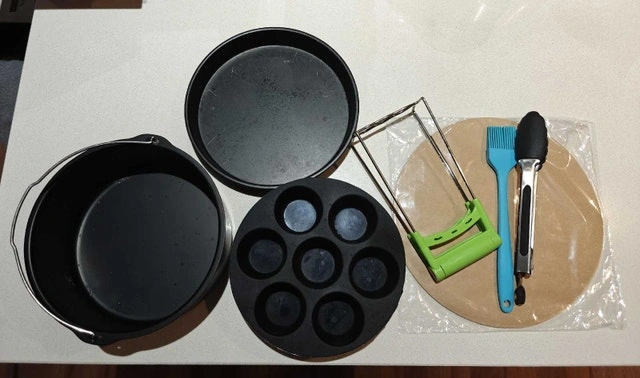 T-fal air fryer with a 4.2L capacity including accessories (tongs, tray grabber tool, trays, silicone brush, silicone muffin tray, paper basket liner). Used with some wear but in working condition.