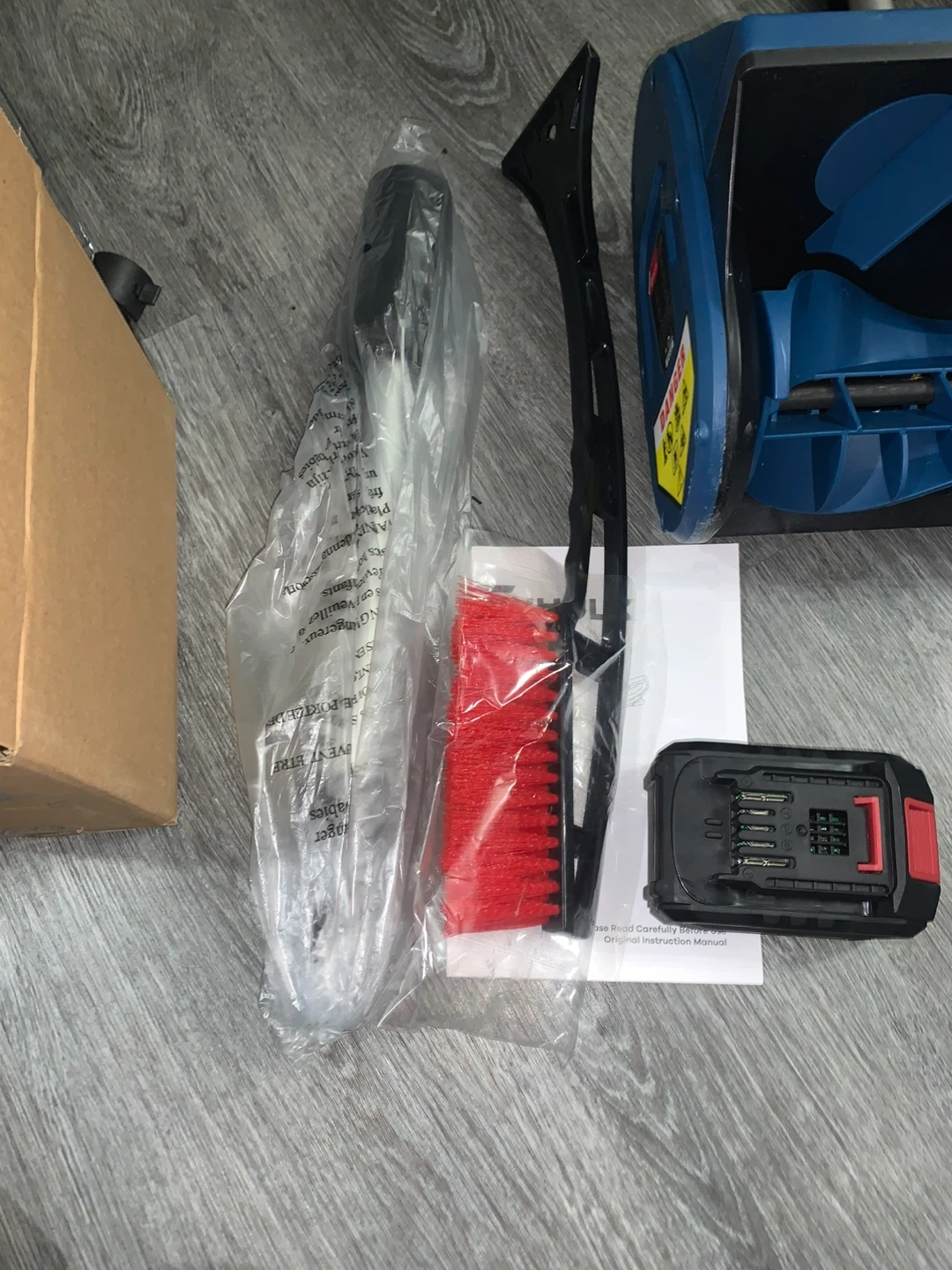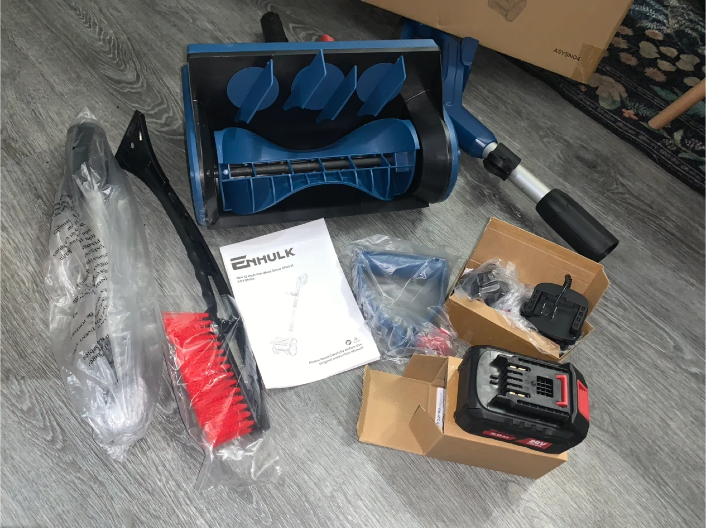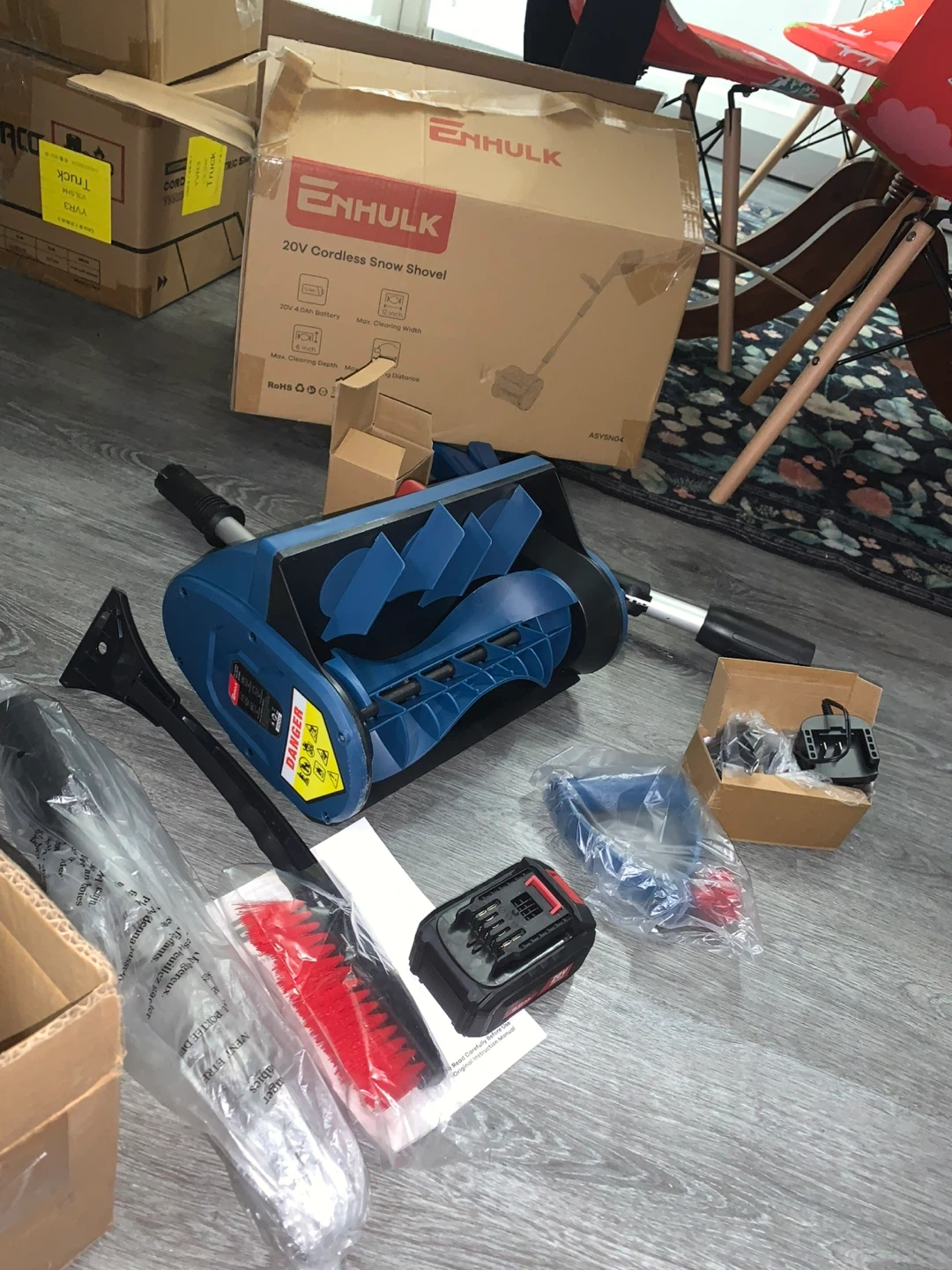 Selling an Enhulk 20V electric snow shovel in blue. It's a 12-inch model and comes with a 4-Ah battery and quick charger. The box is included, along with all the original components and accessories. Great for clearing snow quickly!