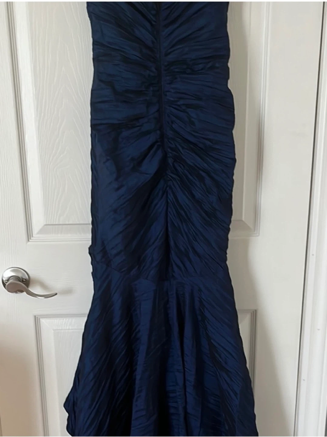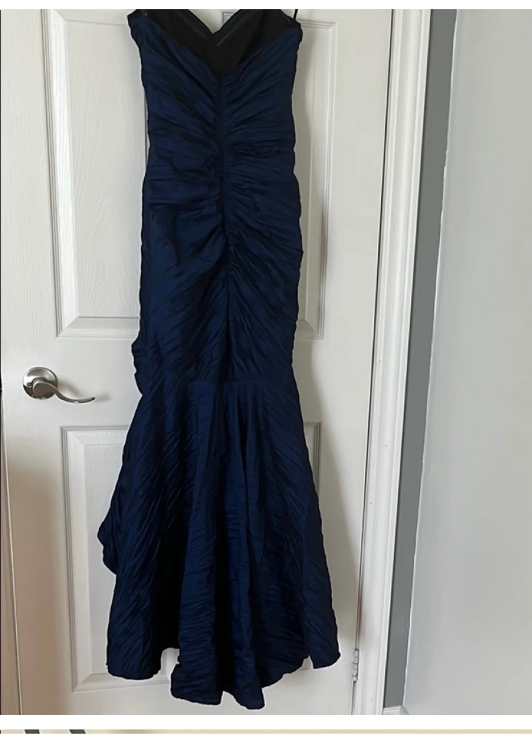 Selling a beautiful navy blue strapless evening gown. It features a unique ruched design and a flattering mermaid silhouette. Perfect for a formal event or special occasion!