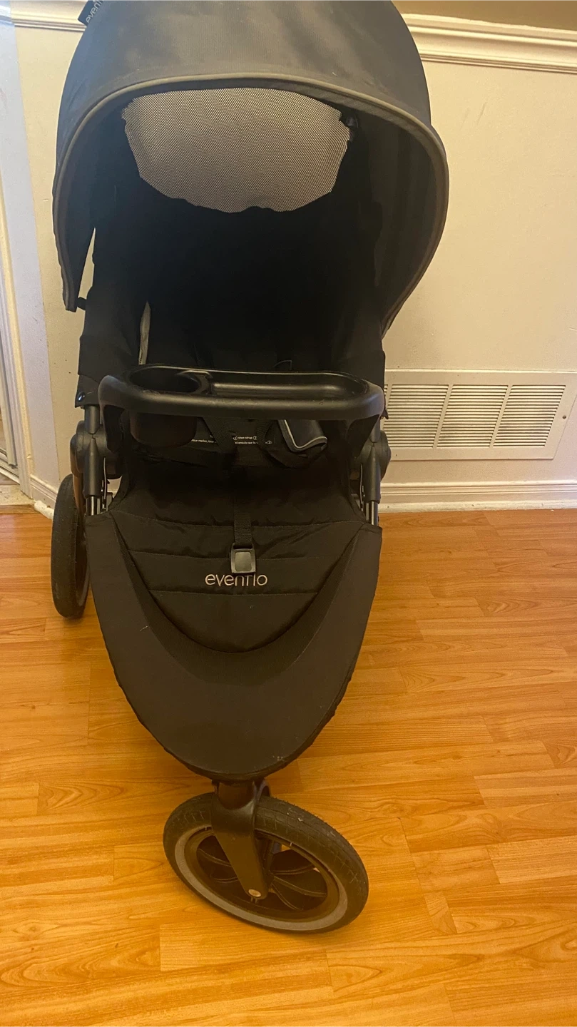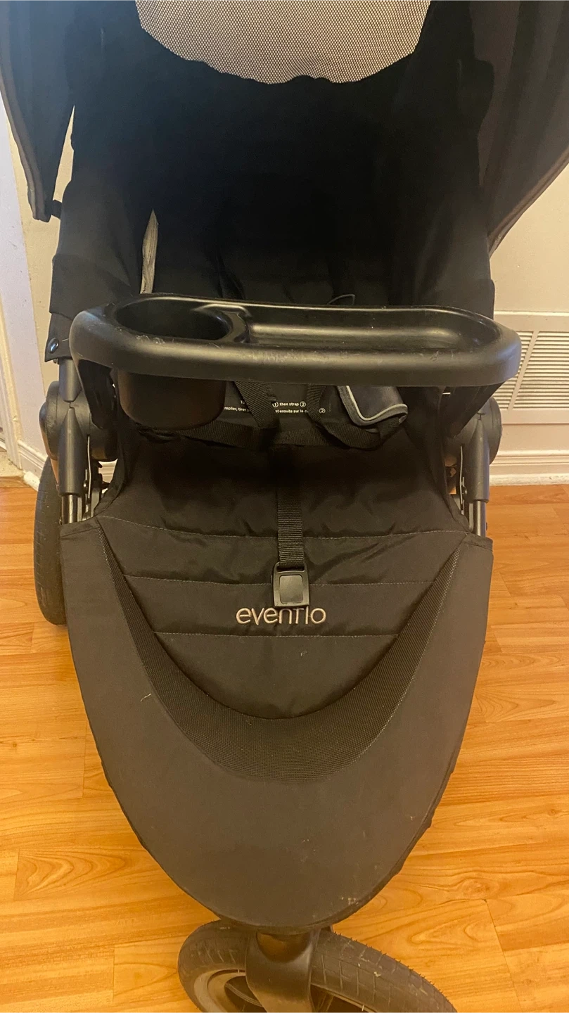 Selling an Evenflo Pivot Xplore All-Terrain Stroller Wagon in black. It's in great condition and ready for new adventures! This versatile stroller wagon is perfect for families on the go.