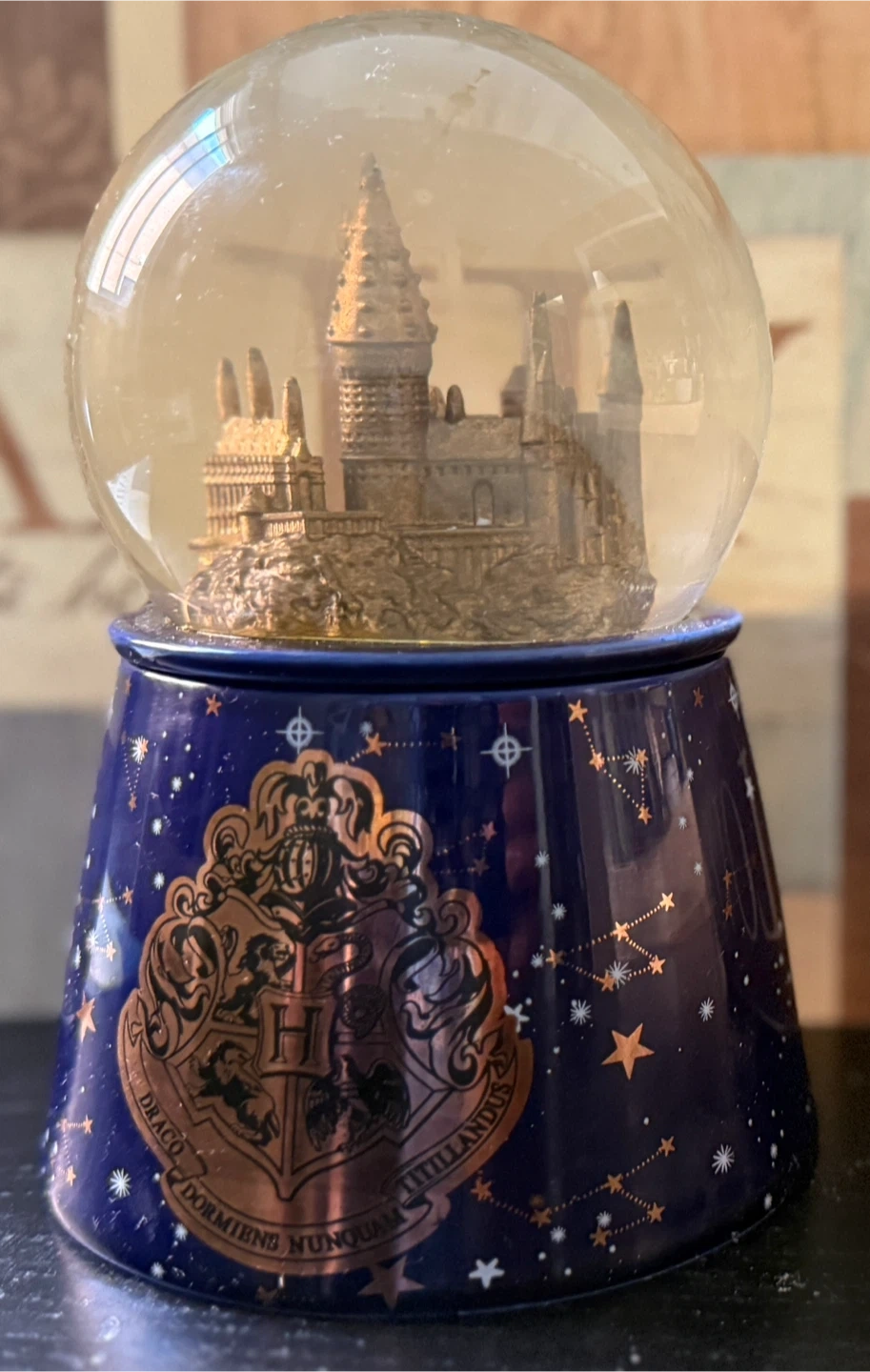 Selling a Harry Potter Hogwarts snow globe candle set. The base of the snow globe and candle holder are a dark blue with gold stars and the Hogwarts crest. Perfect for any Harry Potter fan!