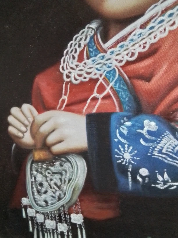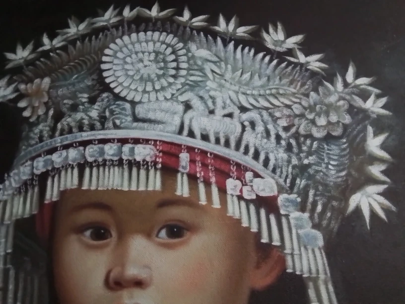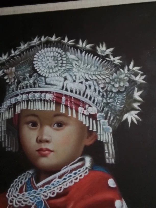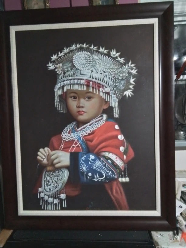 This is a captivating Shih Tai Arts Gallery oil painting, sized at 37x47 inches. This piece is in good condition and features an enchanting portrait of a child, rendered with impressive detail and vibrant colours. It would make a great addition to any art collection!