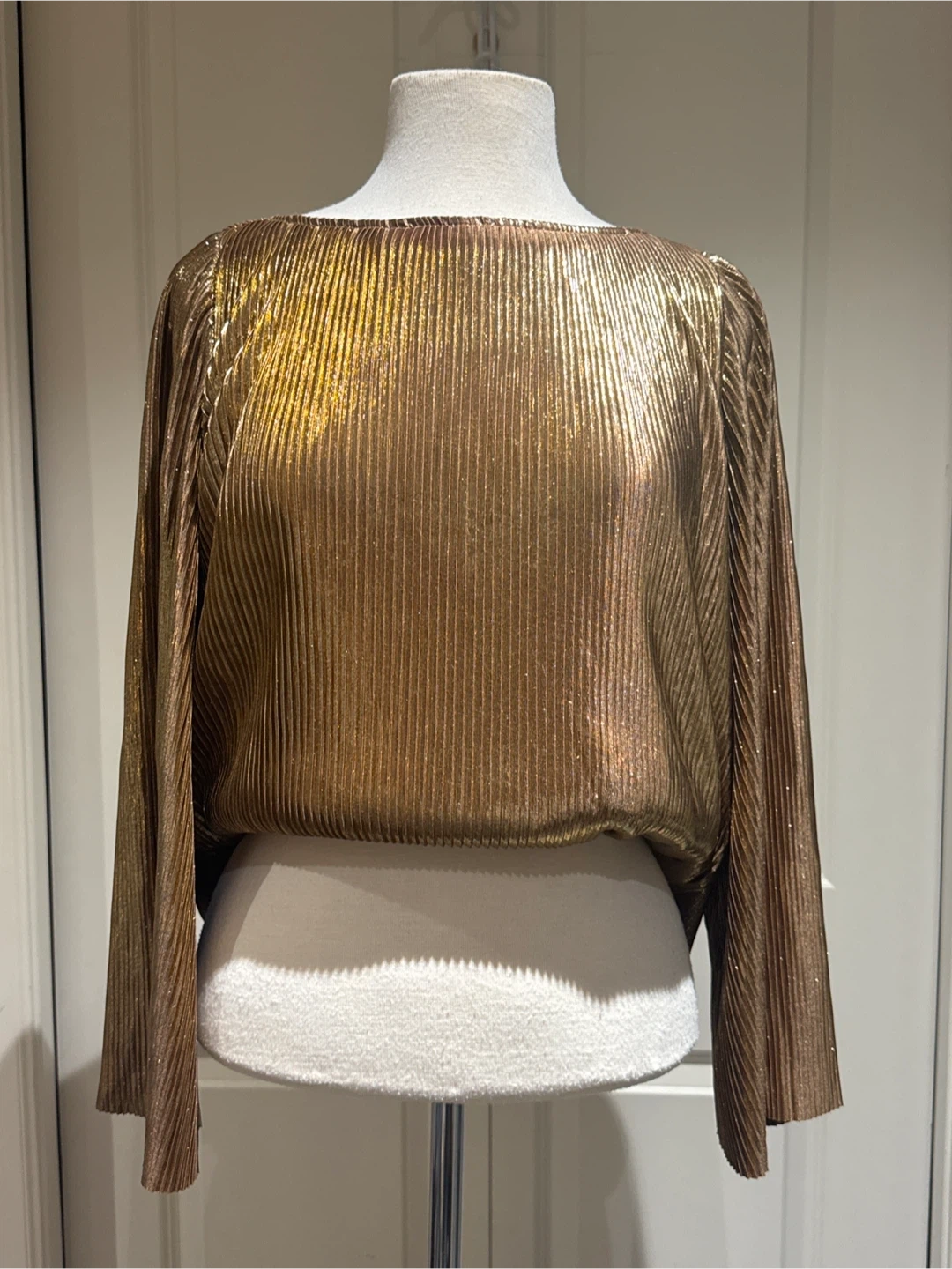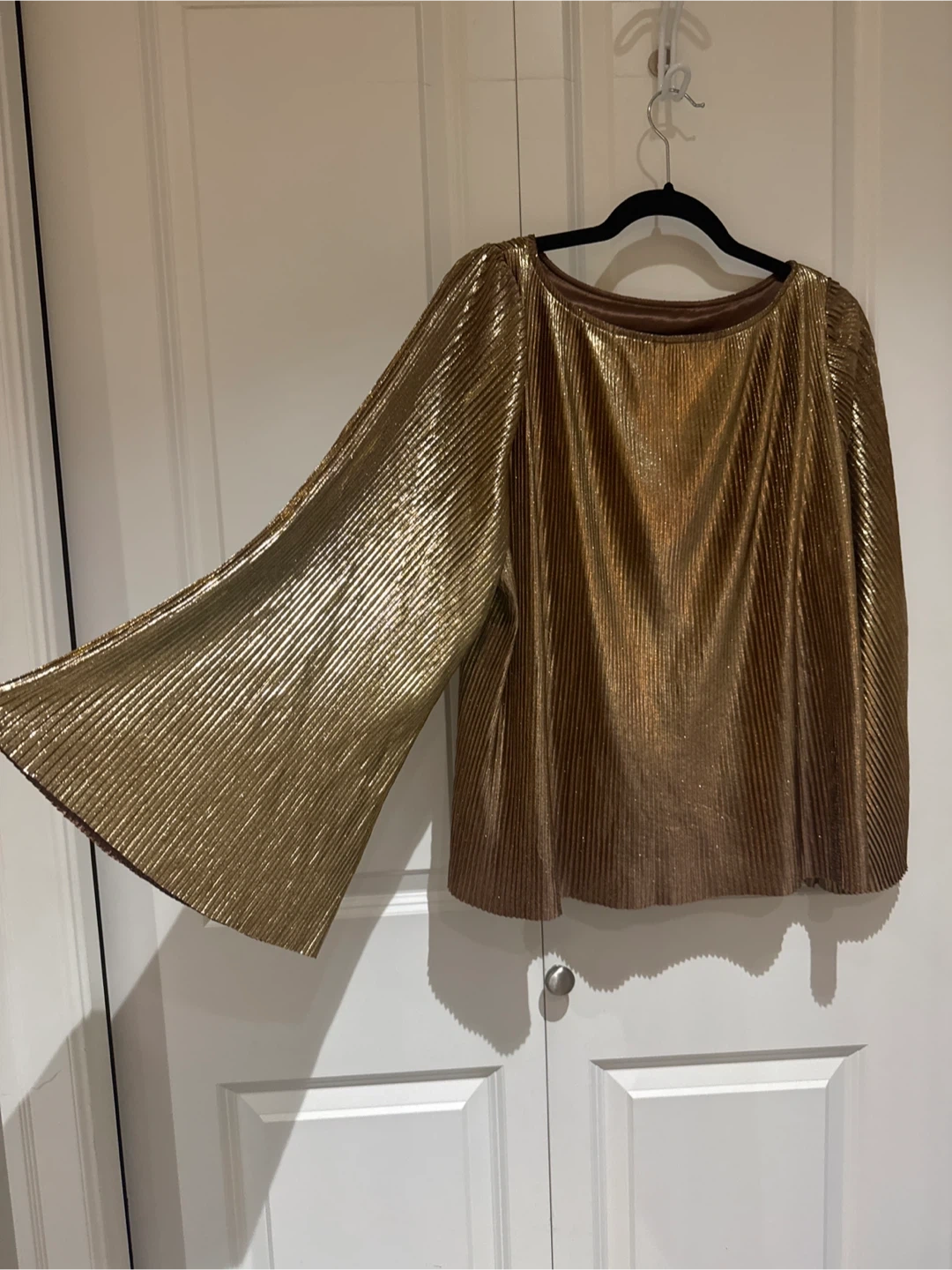 Here's a lovely gold coloured plissé blouse! It has long dramatic wide sleeves and a round neckline. The material has a beautiful shimmer, perfect for dressing up or adding a bit of shine to your everyday look. From 2000’s. Perfect for holidays.