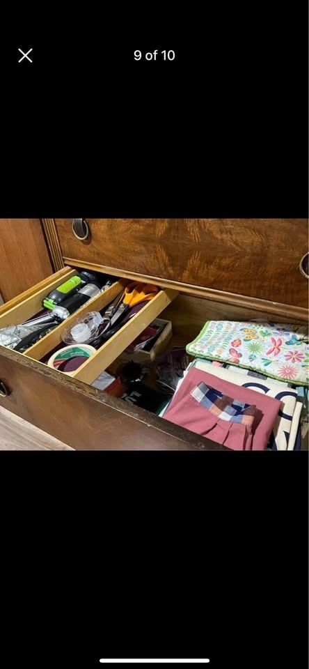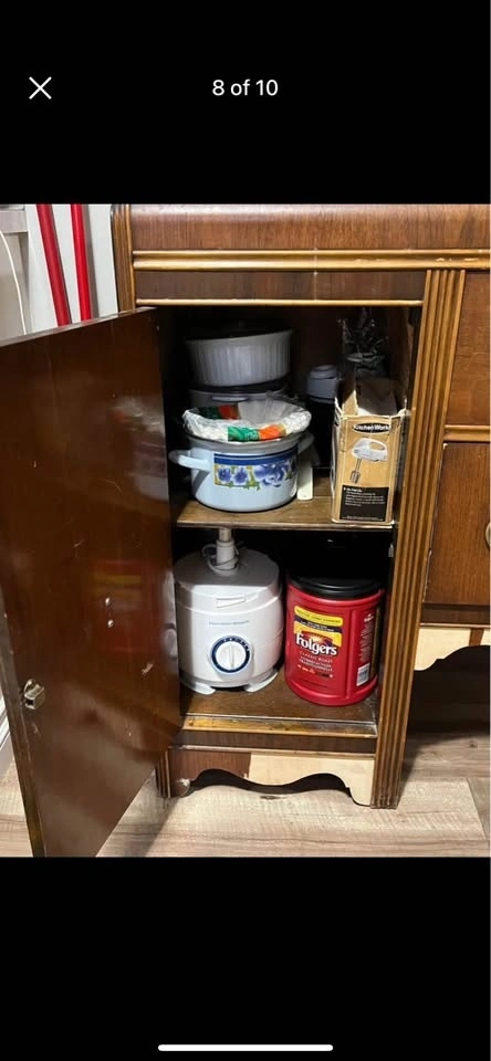 Buffet hutch with a cabinet on each side with a shelf. And two deep and wide drawers in middle.