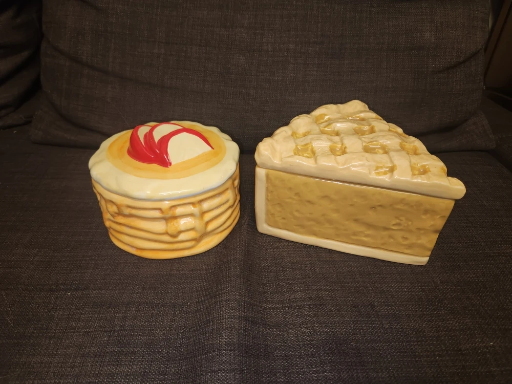 I'm selling a set of ceramic storage containers shaped like a stack of pancakes and a slice of pie. They're super cute and would be a fun addition to any kitchen!