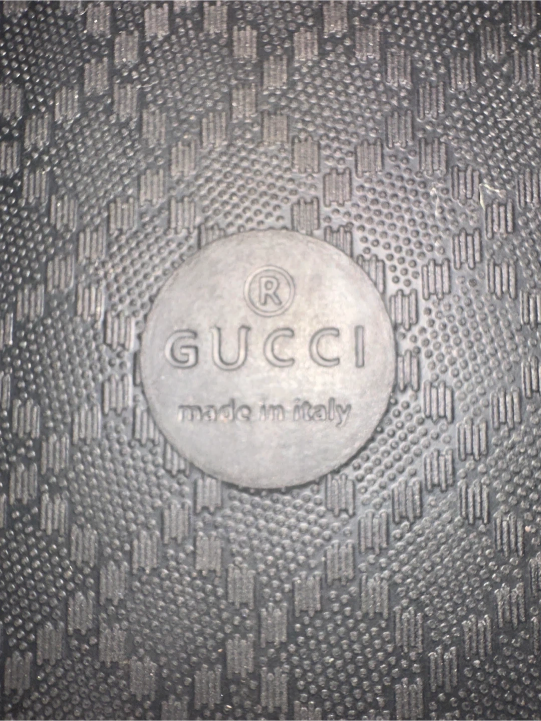 Selling a pair of Gucci slides in size 11. They feature the classic Gucci stripe design with red and green. The soles show the Gucci logo and "made in Italy" detail. Great for casual wear!