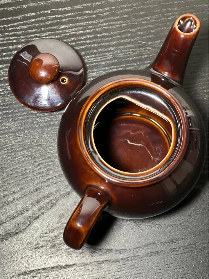 This is a pre-owned Sadler "Brown Betty" style teapot, known for its distinctive dark brown Rockingham glaze. It measures 4” tall and 7” from handle to spout.