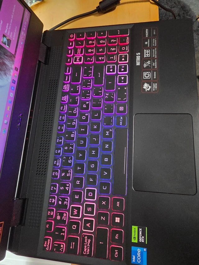 Comes with original box only used once. Model: Acer Nitro 5 AN515-58-52E8. Operating system: Windows 11 Home. Processor: 12th-gen Intel Core dodeca-core i5-12500H 2.5 GHz with performance core; max turbo frequency up to 4.5 GHz; supports hybrid core architecture with performance-core and efficiency-core; 18 MB smart cache. Memory: 8 GB DDR4 3200 MHz; 2 DDR4 slots total; maximum 32 GB. Storage: 512 GB PCIe Gen 4 SSD (2 PCIe M.2 slots total; 1 slot available); (1) 2.5" hard drive bay available. Display: 15.6" FHD (1920 x 1080) widescreen LED-backlit IPS display; 144Hz refresh rate; 16:9 aspect ratio. Camera: HD webcam (1280 x 720) with blue glass lens supporting 720p HD video at 30 fps with temporal noise reduction. Graphics card: NVIDIA GeForce GTX 4050. Networking: Killer Wi-Fi 6 AX 1650i; IEEE 802.11 a/b/g/n/ac/ax; Gigabit Ethernet; Bluetooth 5.1. Ports: (1) HDMI, (1) USB 3.2 Gen 1, (2) USB-C 3.2 Gen 2, (4) Thunderbolt 4 (USB 3.2), (1) network (RJ-45), (1) audio line-in, (1) audio line-out, (1) headphone jack. Webcam: HD with 1280 x 720 resolution; 720p HD audio/video recording super high dynamic range imaging (SHDR). RGB backlit keyboard with dedicated numeric keypad, media control keys, and a precision touchpad (supporting Windows modern touchpad gestures). Battery: 57.5-Wh 4-cell lithium-ion. Productivity: Acer Care Center; Microsoft Office Trial; Cyberlink PhotoDirector; Cyberlink PowerDirector 14; NitroSense; Multimedia Netflix. Colour: black. Dimensions: 21.38"L x 3.15"W x 13.43"H. Weight: 5.51 lbs
