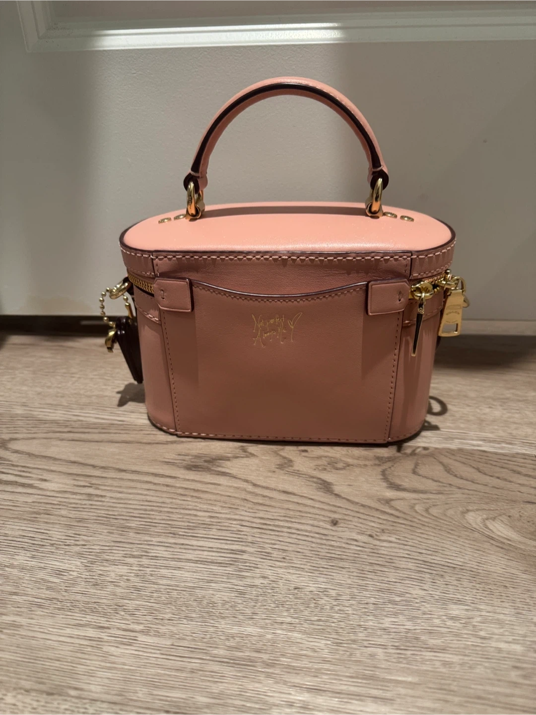 Selling a cute Coach vanity bag in pink leather! It's in great condition and perfect for storing your makeup or other small items. The bag features a top handle, zip closure, and the Coach logo. It's a stylish and practical accessory!