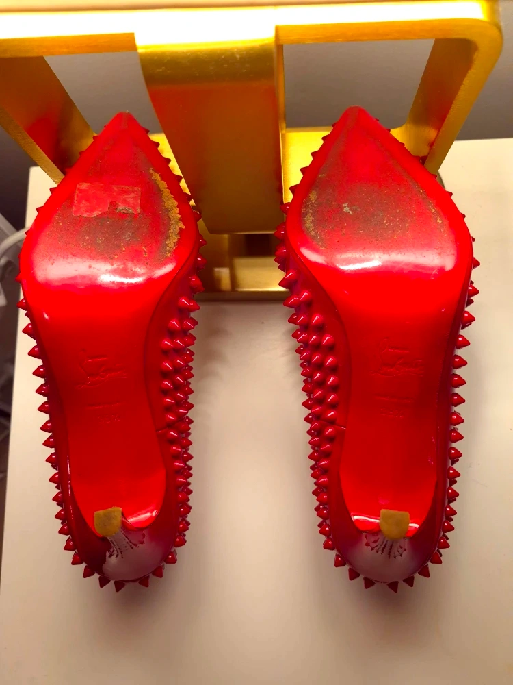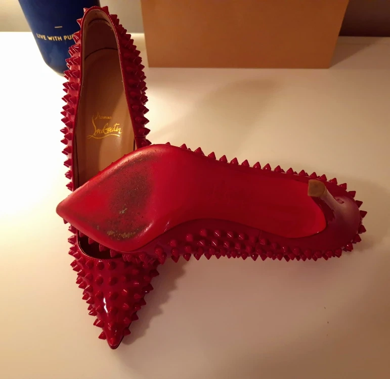 They are of a vibrant red colour and feature a unique spiked design, with a small rubber inside to keep your ankles steady. They come with the original dust bag and shopping bag. There are little signs of wear on the soles, but overall good condition. I have to let them go because I sprained my ankle and can't wear them anymore 😩😢.