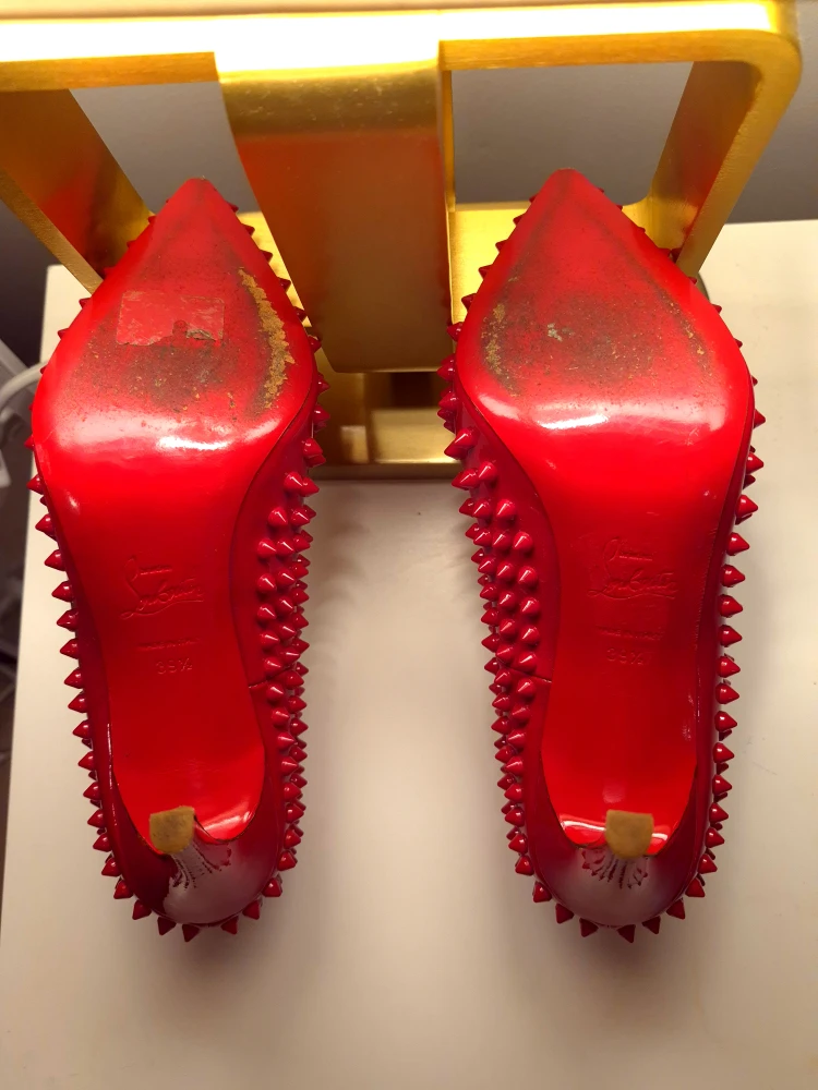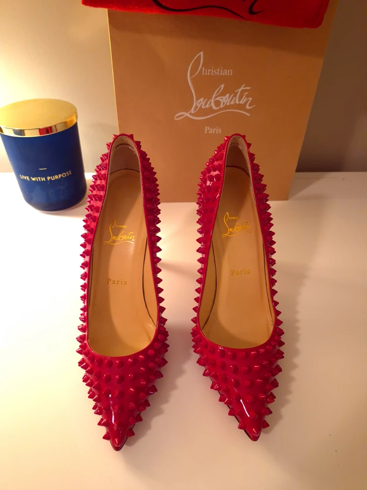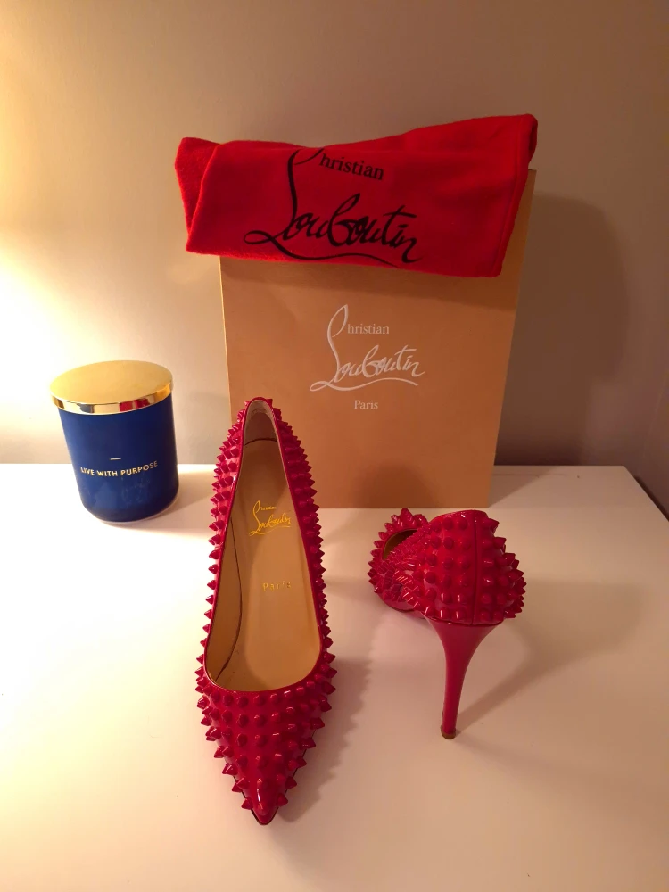 They are of a vibrant red colour and feature a unique spiked design, with a small rubber inside to keep your ankles steady. They come with the original dust bag and shopping bag. There are little signs of wear on the soles, but overall good condition. I have to let them go because I sprained my ankle and can't wear them anymore 😩😢.