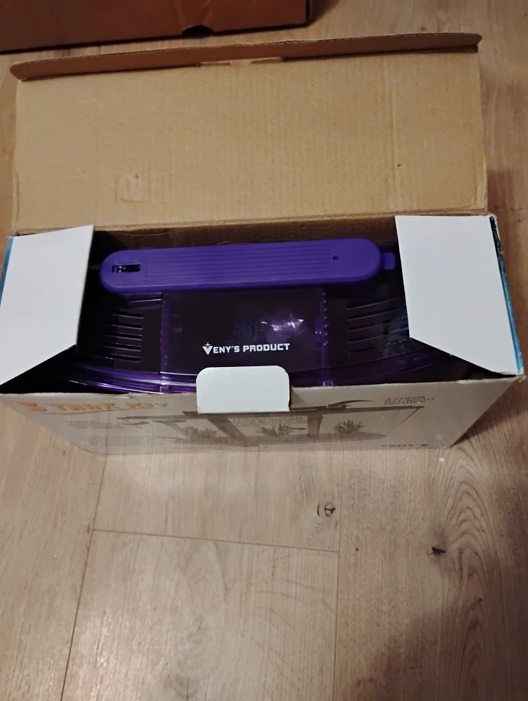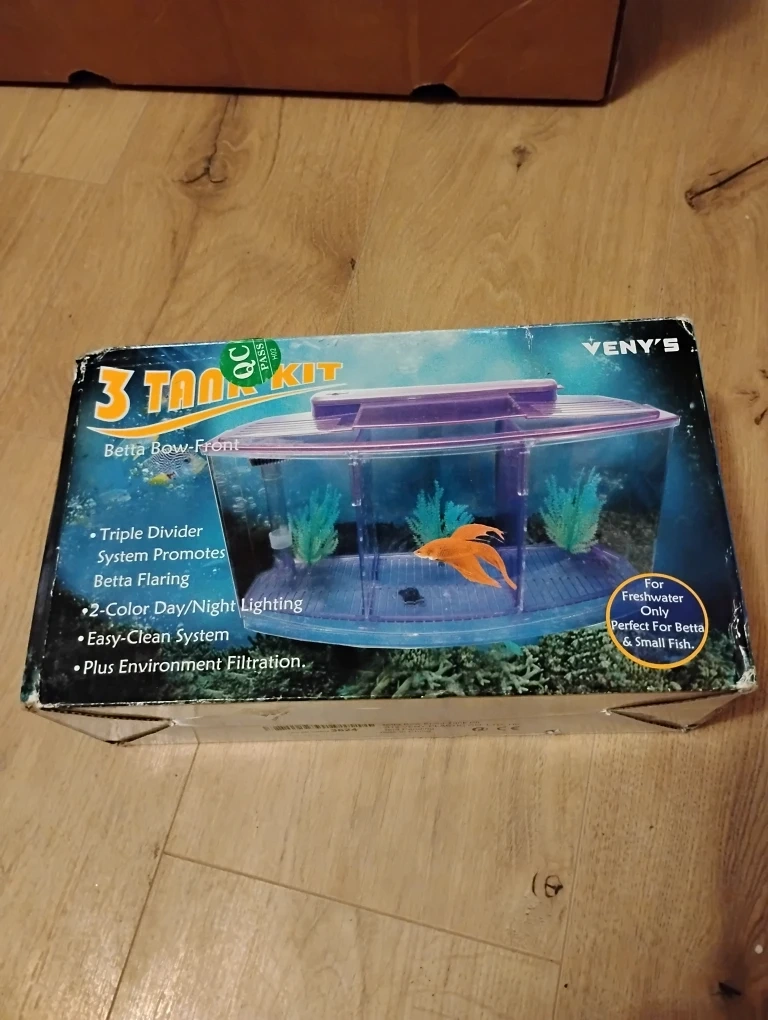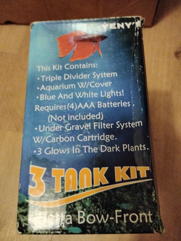 I'm selling a Veny's 3 Tank Kit, perfect for Betta and small fish. It features a triple divider system, an aquarium with a cover, and 2-color day/night lighting. It also includes an under gravel filter system with a carbon cartridge, and 3 glow-in-the-dark plants. The box is included!