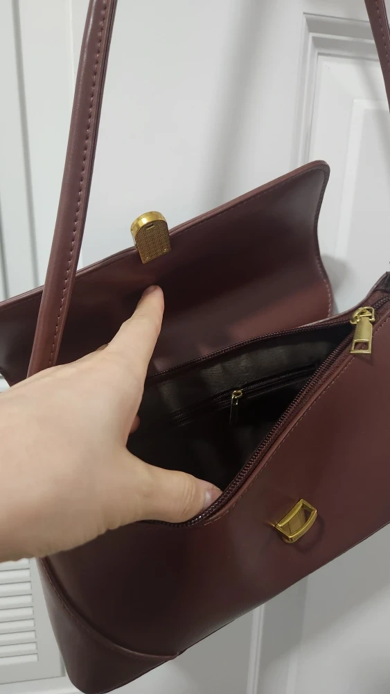 A stylish burgundy shoulder bag is up for grabs! It's in great shape and ready to add a touch of elegance to your outfit. The bag features a unique clasp and a convenient zippered interior pocket. Perfect for everyday use or a night out!