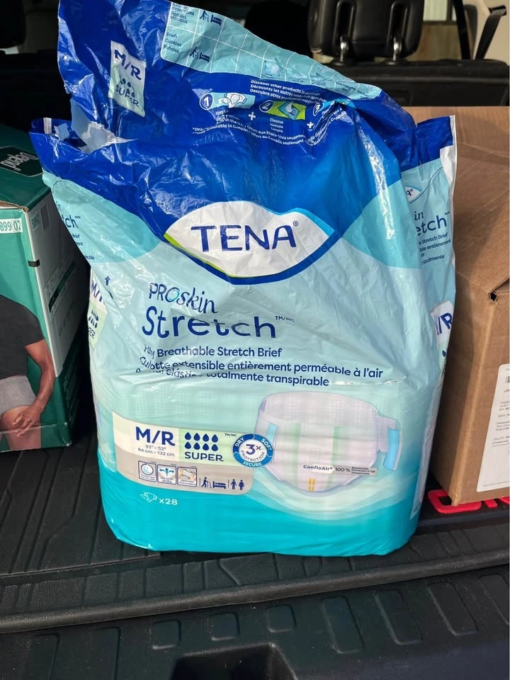 28 x med/reg men’s diaper style stretch diapers. Half still in bag. Half taken out but put in a box.