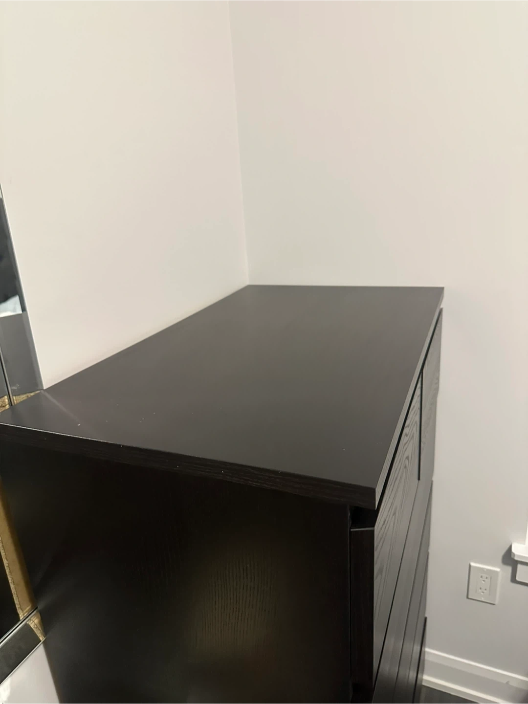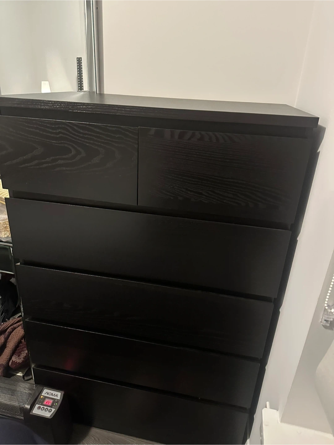 Selling a gently used IKEA chest/ dresser in black-brown. It has six drawers, offering lots of storage space. Very versatile! Perfect for organizing clothes or other items in your bedroom or living area. It's in excellent condition, like new. Barely used, have not had it for more than 1 year.