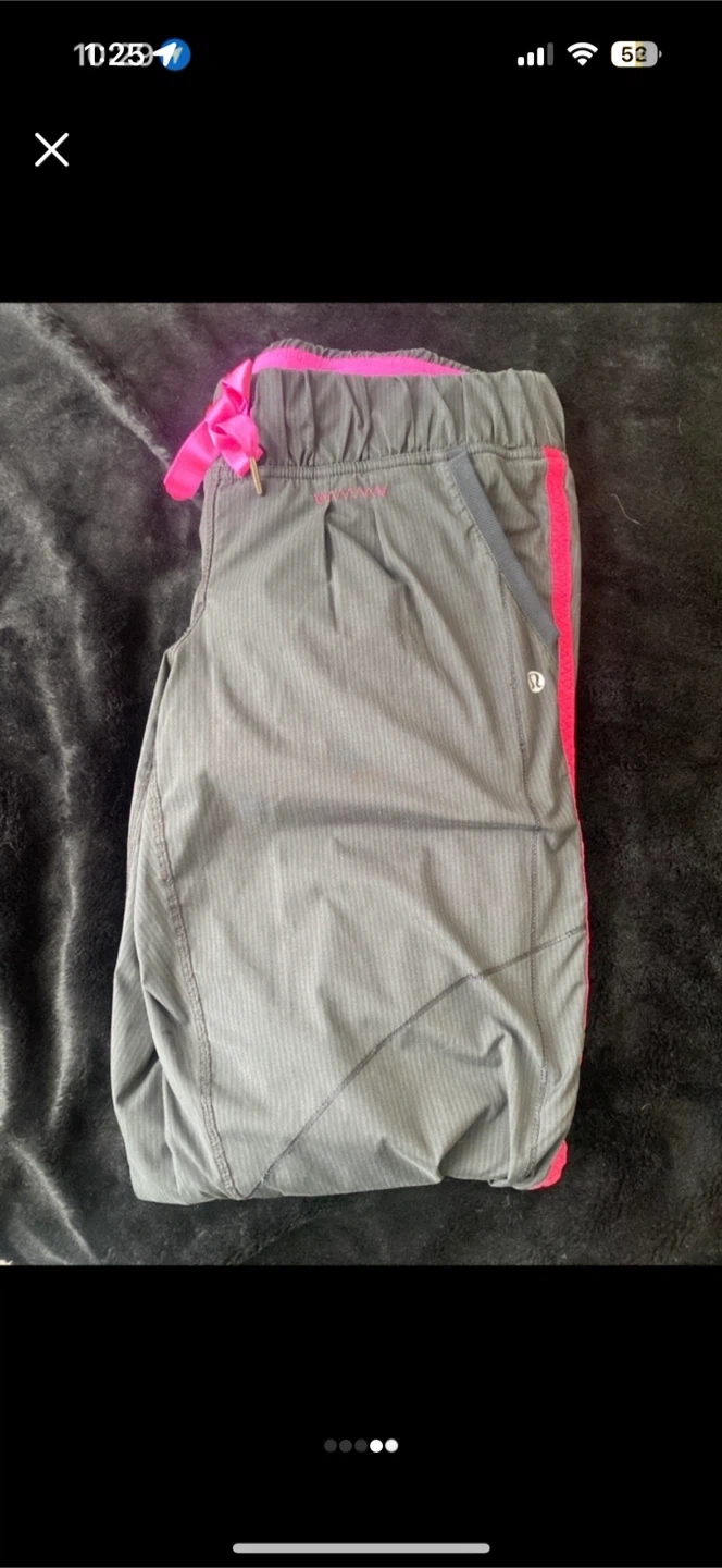 Selling a pair of Lululemon women's pants in grey with pink accents. They feature a drawstring waist and a comfortable fit. Perfect for workouts or casual wear! Size 8 pick up cash only