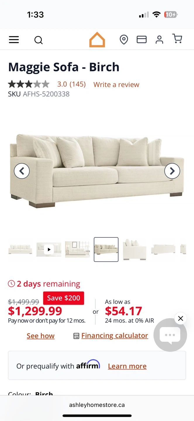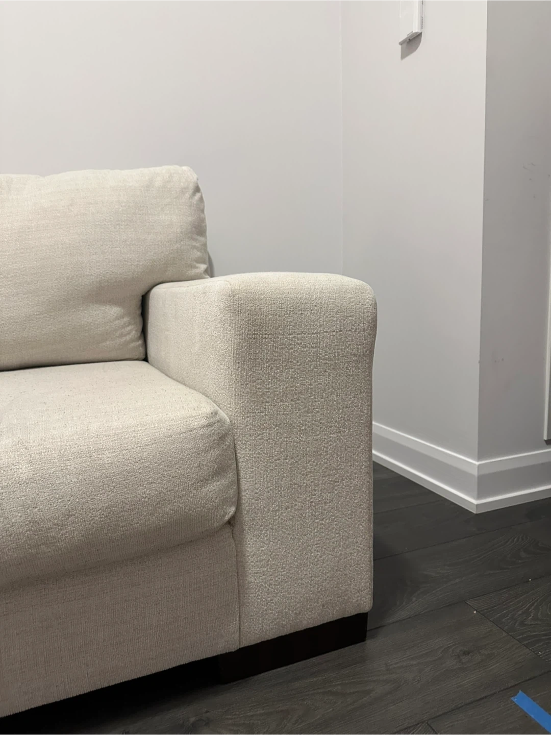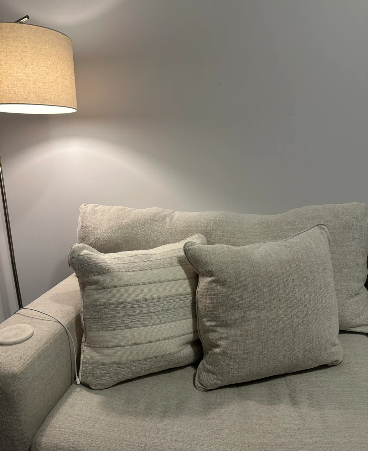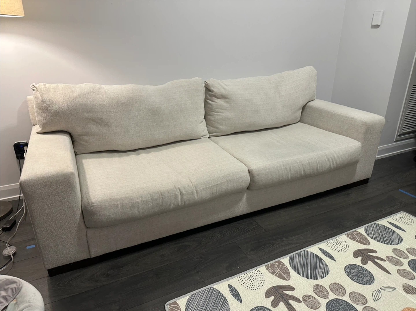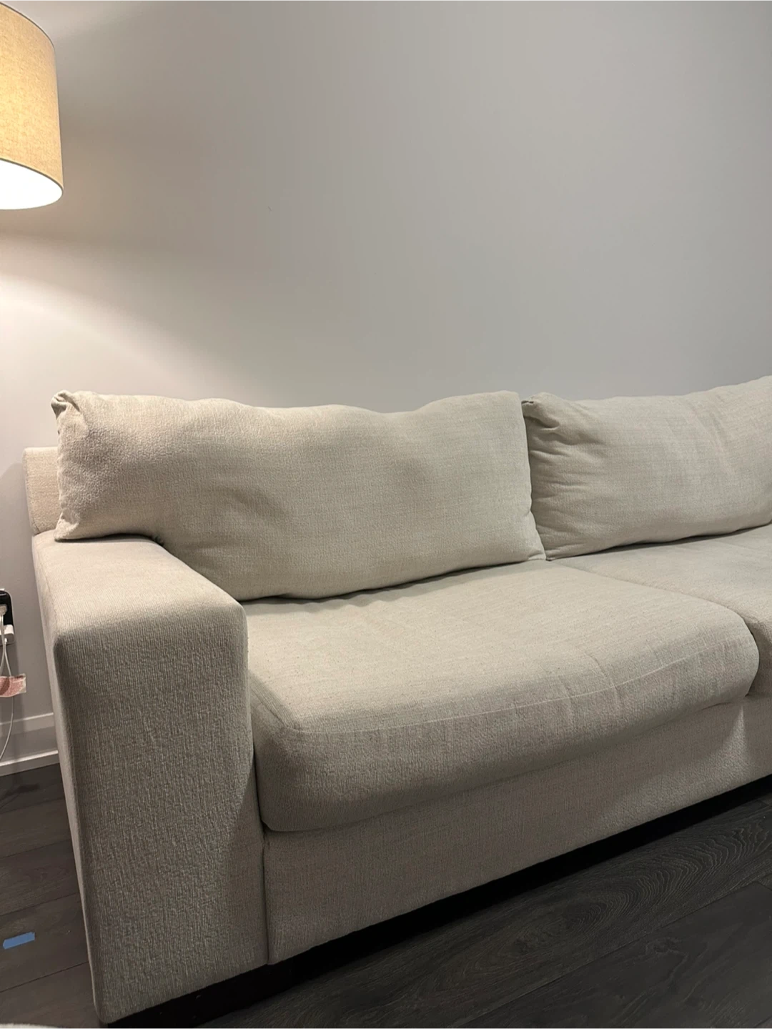 Maggie couch from Ashley. In colour Birch. In excellent condition. Very comfortable couch and very modern looking. Only used for 1 year. Very aesthetic, it’s a cream colour with thick wooden legs. Comes with 4 accent pillows as well in mint condition that were barely ever used.