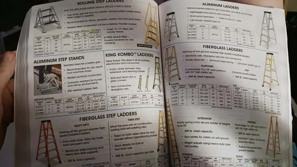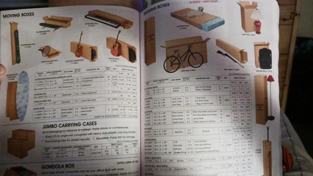 This catalog has everything from envelopes and tape, to ladders and scaffolding. You can order workboots and tools! You can get cleaning supplies and the equipment used! As well as boxes of all shapes and sizes for every job from storage and filing for moving things like lamps and T.V's, and everything else!