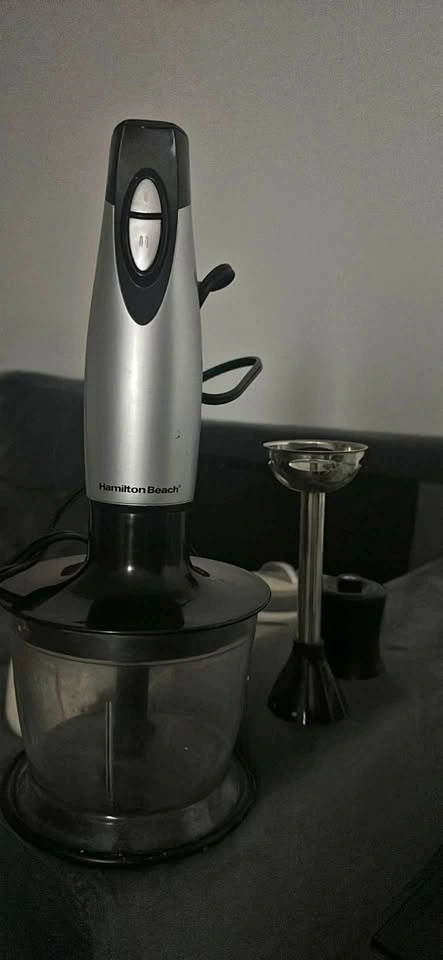 Hamilton Beach 2-speed hand blender for precise control. Includes 3 attachments: blending wand, whisk, and chopping bowl. Perfect for soups, sauces, smoothies, whipped cream, and small chopping tasks. Compact and easy to store. Dishwasher-safe attachments for easy cleaning. Excellent condition. Pickup in Brampton!
