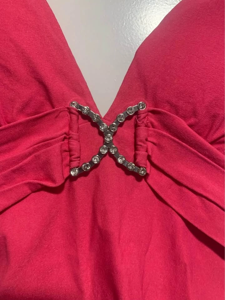This doesn’t have a tag and looks like it was handmade. I’d say it is a size small it would fit medium the fabric is stretchy. Worn a few times.