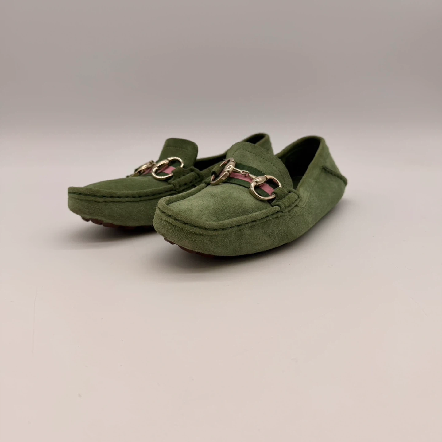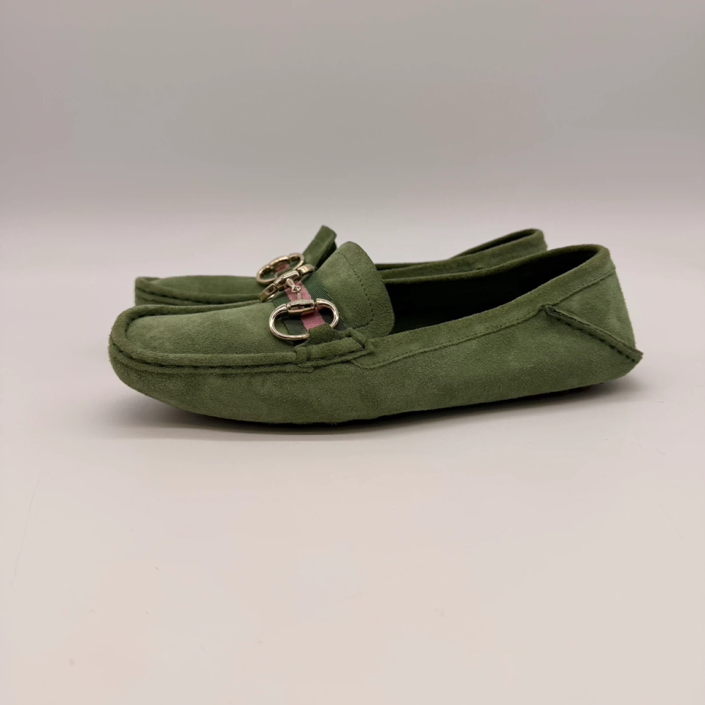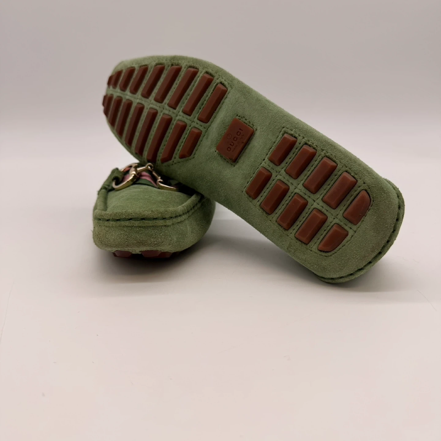 Authentic Gucci green suede horsebit driving loafers in excellent condition. Classic Gucci moccasin style with silver horsebit hardware and rubber driving sole. Made in Italy.