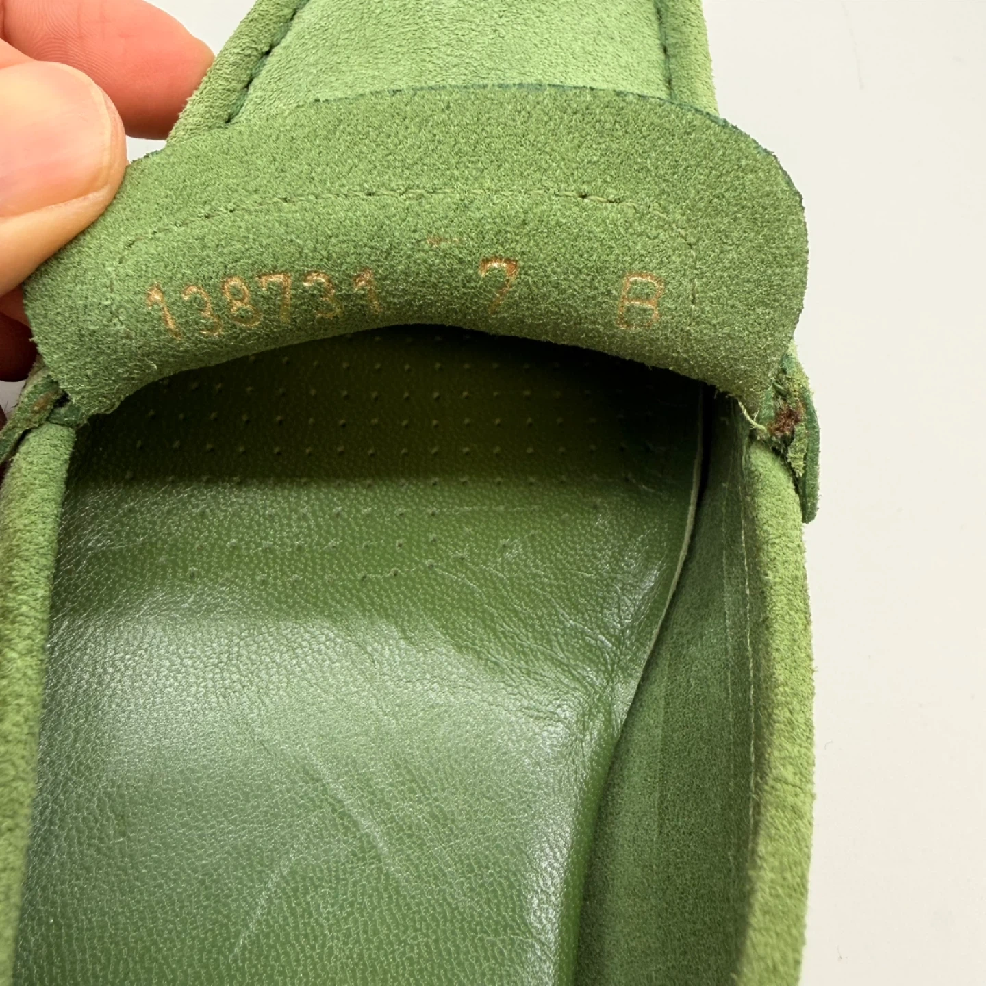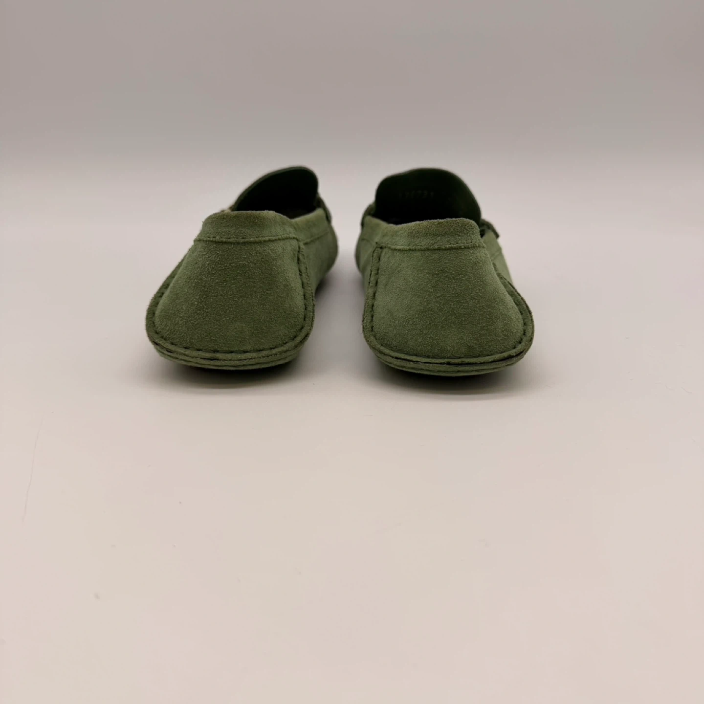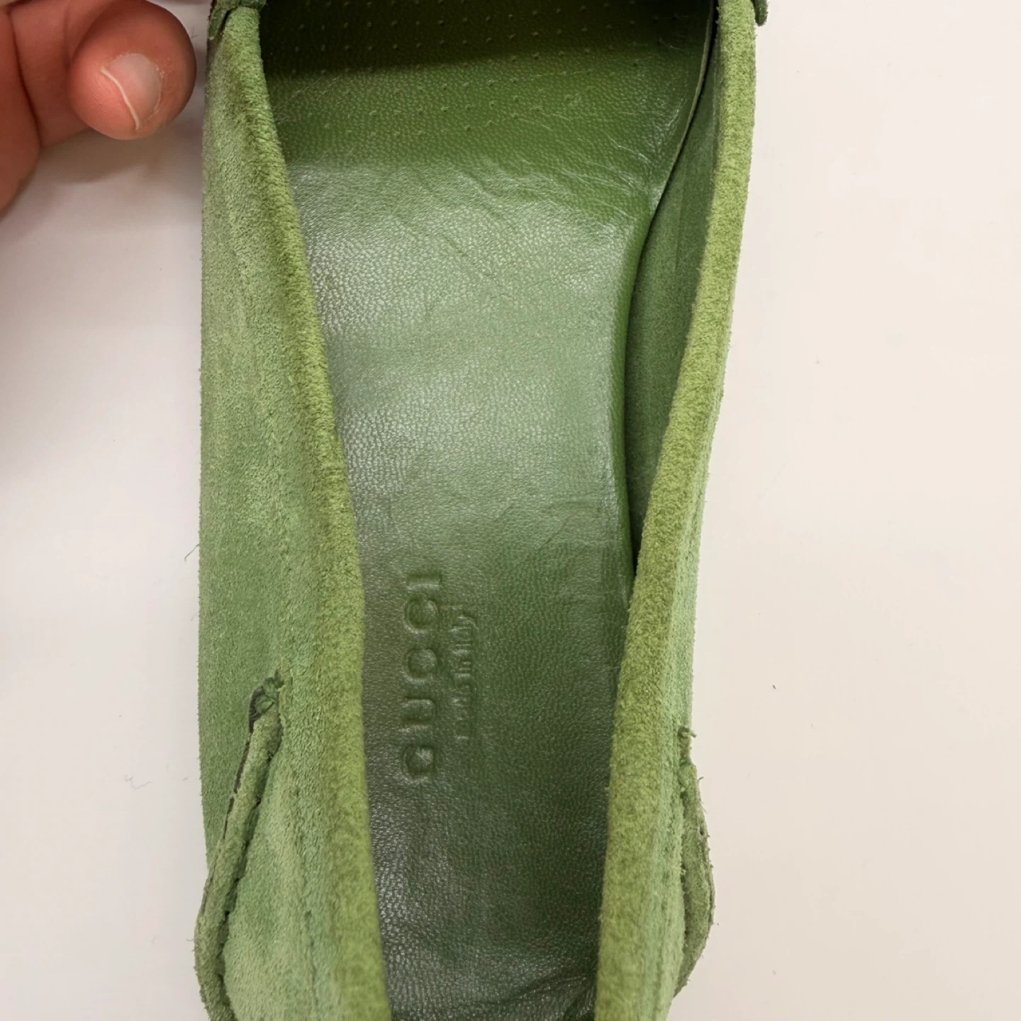 Authentic Gucci green suede horsebit driving loafers in excellent condition. Classic Gucci moccasin style with silver horsebit hardware and rubber driving sole. Made in Italy.