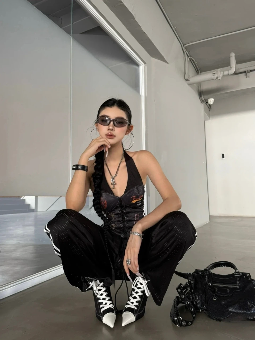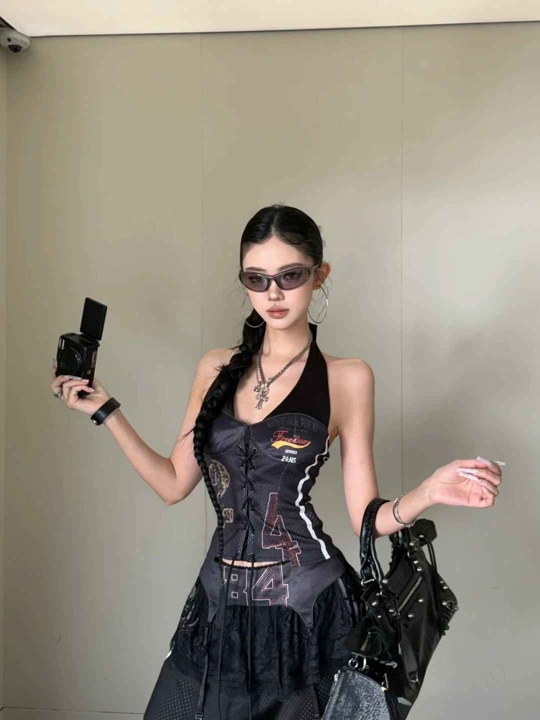 This is a vintage black top with a halter neck design. It features various graphic prints and lace-up detailing in the front. Perfect for adding a unique edge to your outfit!
