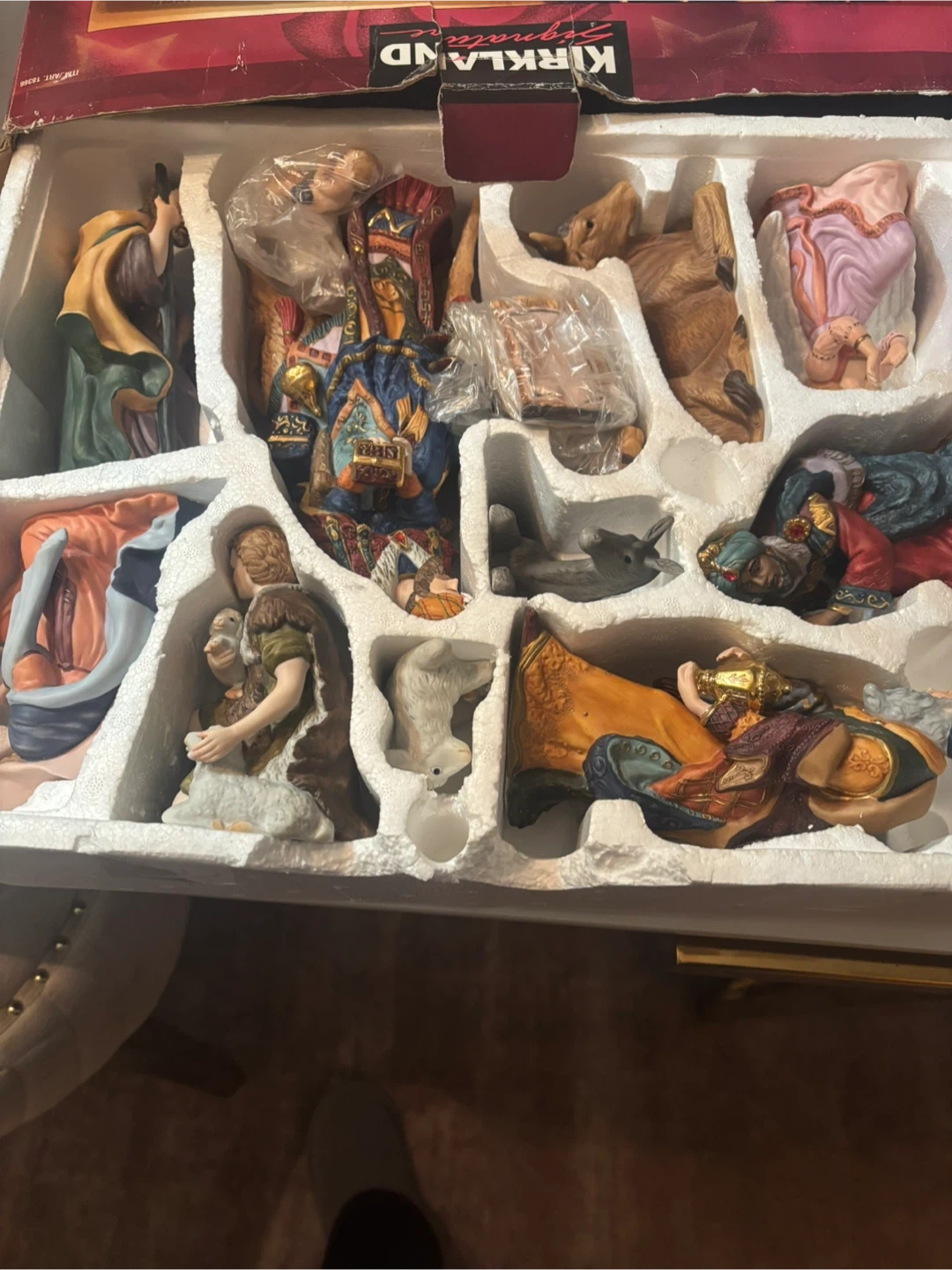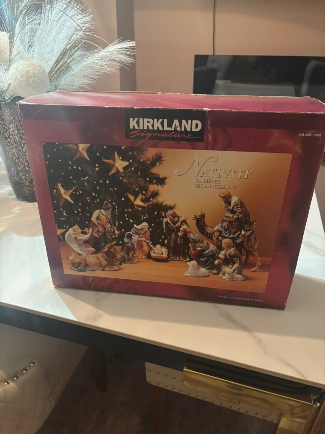 Selling a Kirkland Signature Nativity set. It's a 12-piece set made of porcelain. The set comes in its open original box.